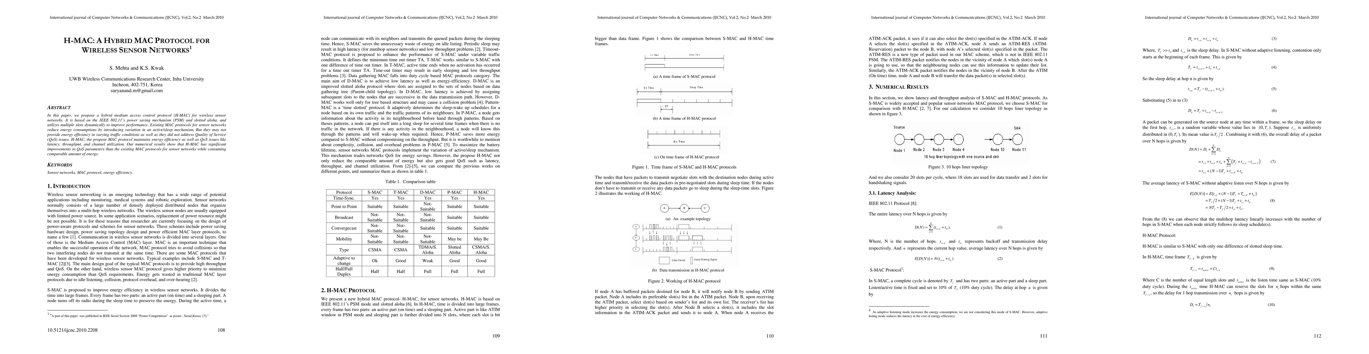 H-MAC is a hybrid medium access control protocol for wireless sensor networks that combines IEEE 802.11's power saving mechanism and slotted aloha to enhance performance and address Quality of Service (QoS) issues. It achieves significant improvements in QoS parameters like latency and throughput while maintaining comparable energy efficiency.