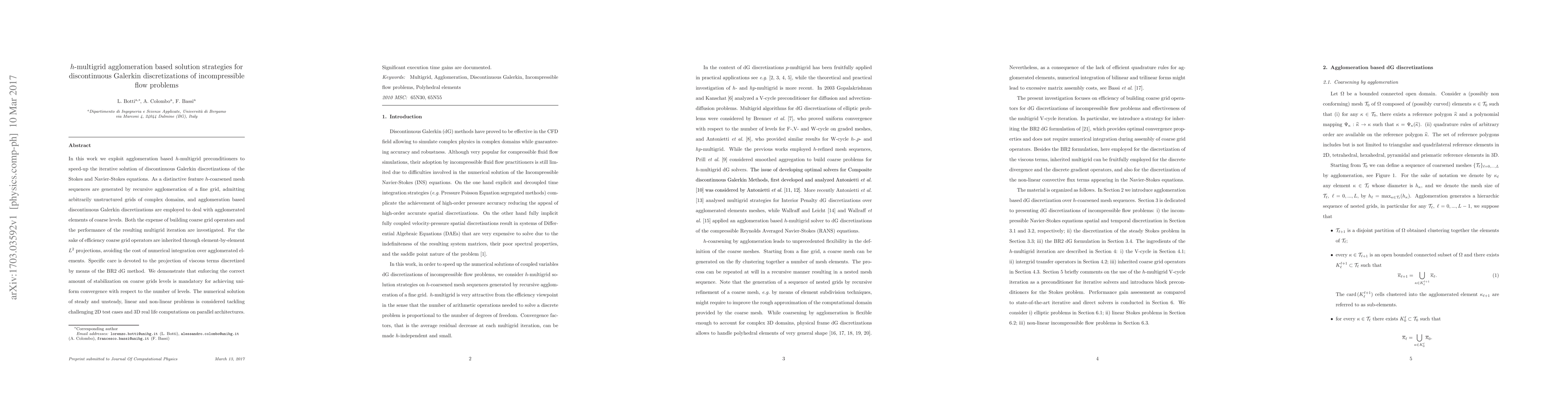 This paper proposes an $h$-multigrid agglomeration strategy for solving discontinuous Galerkin discretizations of incompressible flow problems, demonstrating significant execution time gains through efficient coarse grid operator construction and iterative solver performance. The study emphasizes the importance of stabilization on coarse grids for uniform convergence and tests the method on various 2D and 3D problems.