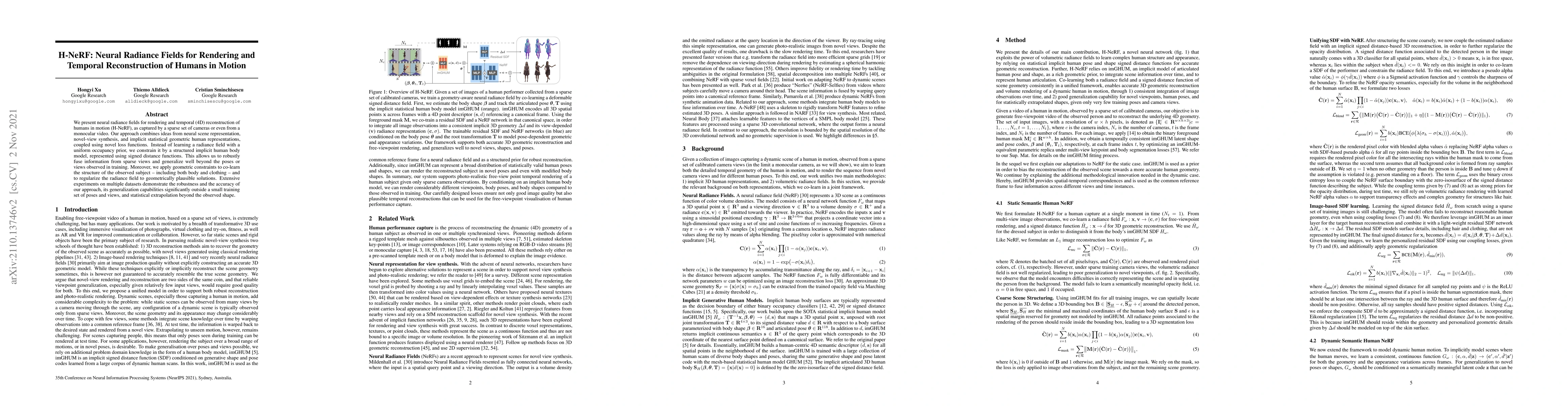 This paper introduces H-NeRF for rendering and temporal reconstruction of humans in motion using neural radiance fields, combining neural scene representation with implicit human body models. The approach leverages structured constraints and geometric regularization to generalize beyond training data, demonstrated through robust experiments on various datasets.