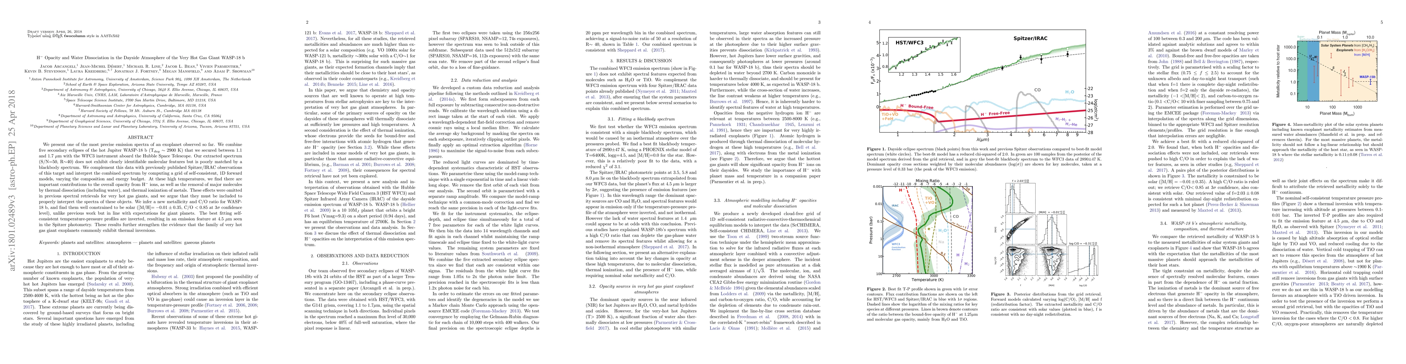 We present one of the most precise emission spectra of an exoplanet observed so far. We combine five secondary eclipses of the hot Jupiter WASP-18 b (Tday=2900K) that we secured between 1.1 and 1.7 micron with the WFC3 instrument aboard the Hubble Space Telescope. Our extracted spectrum (S/N=50, R=40) does not exhibit clearly identifiable molecular features but is poorly matched by a blackbody spectrum. We complement this data with previously published Spitzer/IRAC observations of this target and interpret the combined spectrum by computing a grid of self-consistent, 1D forward models, varying the composition and energy budget. At these high temperatures, we find there are important contributions to the overall opacity from H- ions, as well as the removal of major molecules by thermal dissociation (including water), and thermal ionization of metals. These effects were omitted in previous spectral retrievals for very hot gas giants, and we argue that they must be included to properly interpret the spectra of these objects. We infer a new metallicity and C/O ratio for WASP-18 b, and find them well constrained to be solar ([M/H]=-0.01 (0.35), C/O<0.85 at 3 sigma confidence level), unlike previous work but in line with expectations for giant planets. The best fitting self-consistent temperature-pressure profiles are inverted, resulting in an emission feature at 4.5 micron seen in the Spitzer photometry. These results further strengthen the evidence that the family of very hot gas giant exoplanets commonly exhibit thermal inversions.