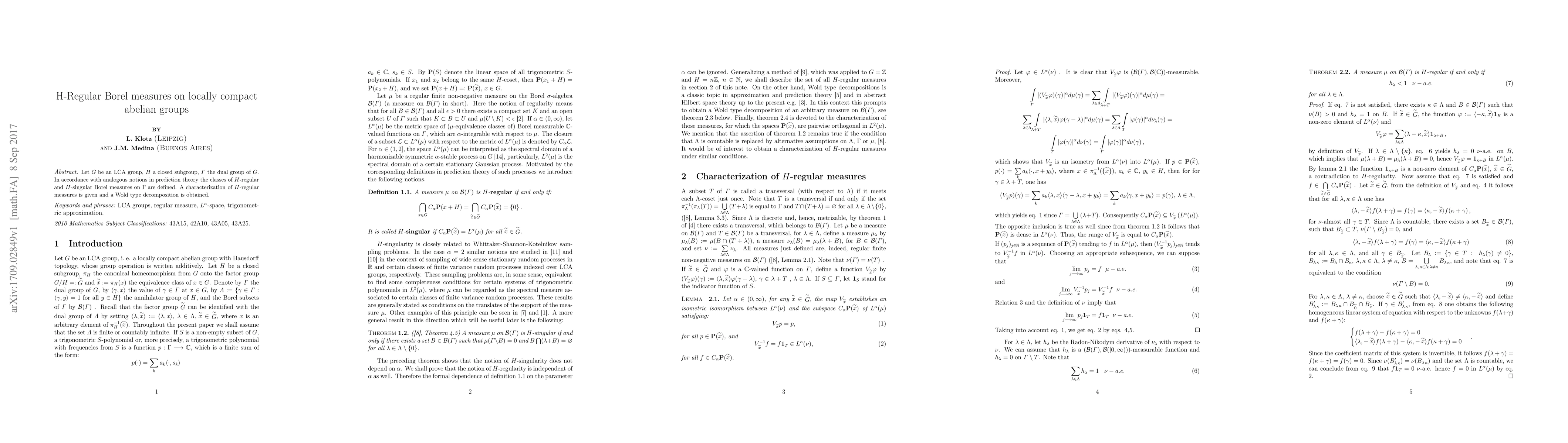 Let $G$ be an LCA group, $H$ a closed subgroup, $\varGamma$ the dual group of $G$. In accordance with analogous notions in prediction theory the classes of $H$-regular and $H$-singular Borel measures on $\Gamma$ are defined. A characterization of $H$-regular measures is given and a Wold type decomposition is obtained.