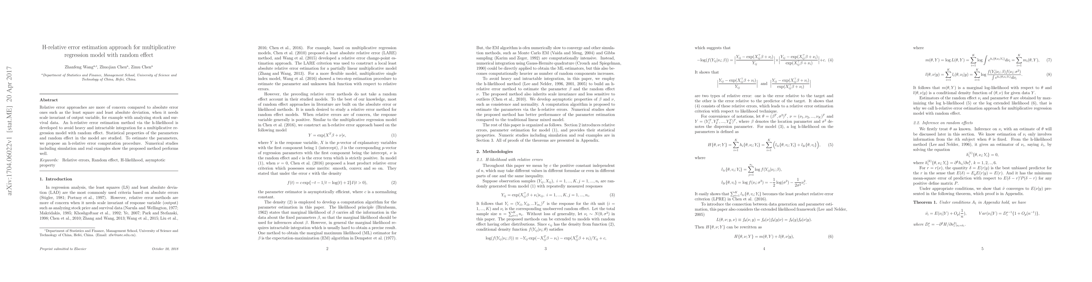 Relative error approaches are more of concern compared to absolute error ones such as the least square and least absolute deviation, when it needs scale invariant of output variable, for example with analyzing stock and survival data. An h-relative error estimation method via the h-likelihood is developed to avoid heavy and intractable integration for a multiplicative regression model with random effect. Statistical properties of the parameters and random effect in the model are studied. To estimate the parameters, we propose an h-relative error computation procedure. Numerical studies including simulation and real examples show the proposed method performs well.