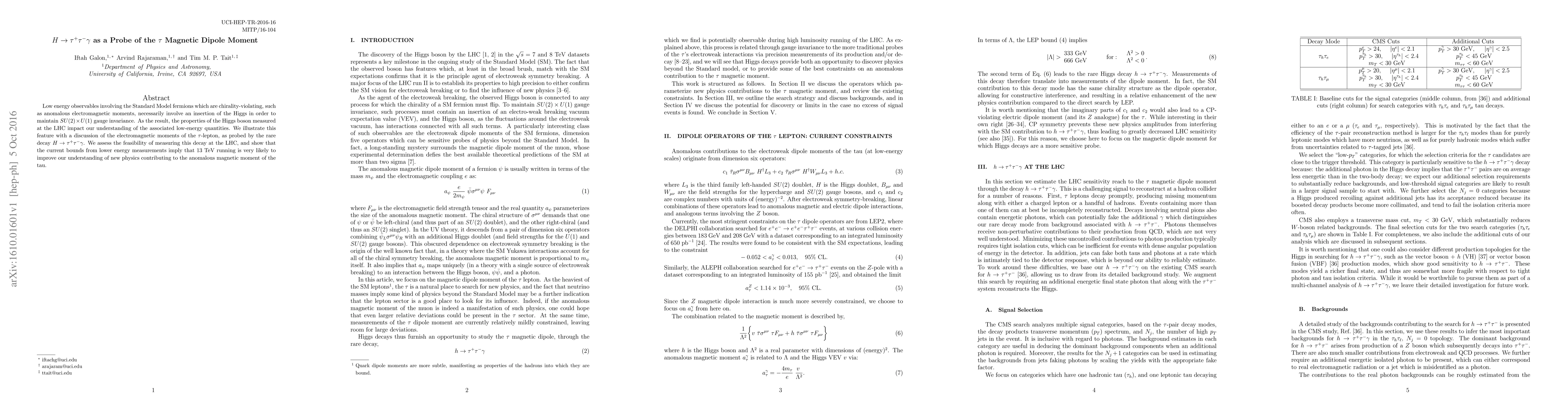 Low energy observables involving the Standard Model fermions which are chirality-violating, such as anomalous electromagnetic moments, necessarily involve an insertion of the Higgs in order to maintain $SU(2) \times U(1)$ gauge invariance. As the result, the properties of the Higgs boson measured at the LHC impact our understanding of the associated low-energy quantities. We illustrate this feature with a discussion of the electromagnetic moments of the $\tau$-lepton, as probed by the rare decay $H \rightarrow \tau^+ \tau^- \gamma$. We assess the feasibility of measuring this decay at the LHC, and show that the current bounds from lower energy measurements imply that $13~\rm{TeV}$ running is very likely to improve our understanding of new physics contributing to the anomalous magnetic moment of the tau.