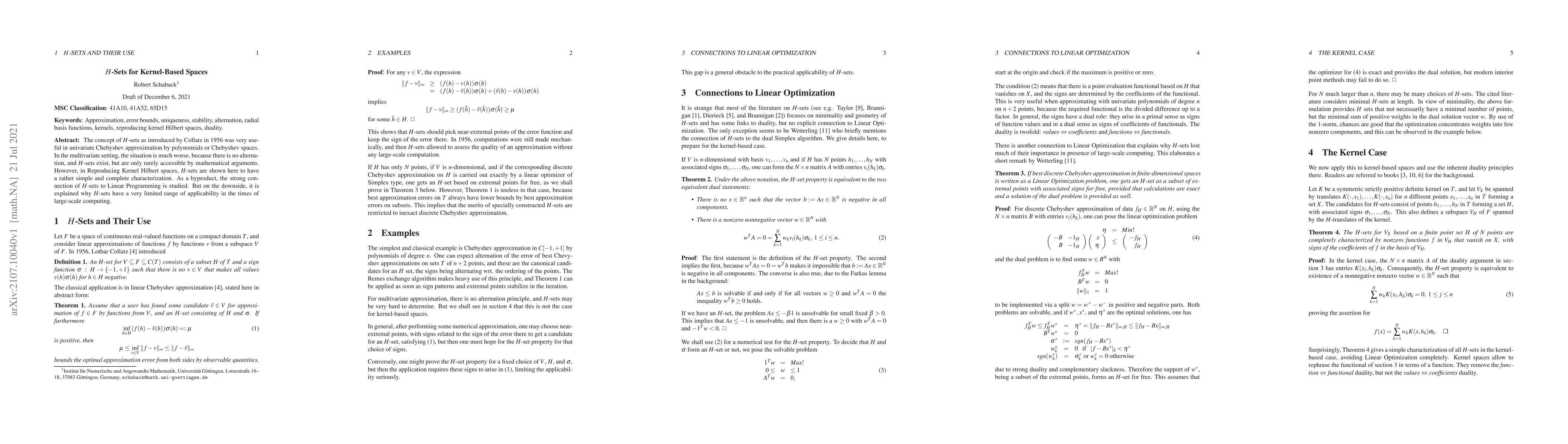 This paper explores the characterization of $H$-sets within Reproducing Kernel Hilbert spaces, revealing their simplicity and connection to Linear Programming, while also discussing their limited applicability in large-scale computing scenarios.