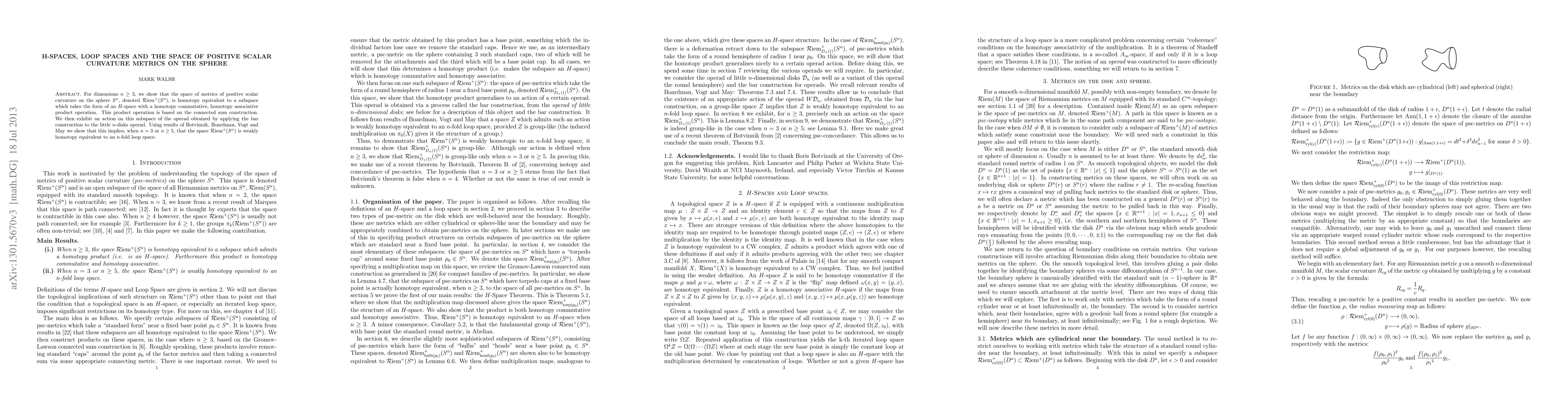 For dimensions n greater than or equal to 3, we show that the space of metrics of positive scalar curvature on the n-sphere is homotopy equivalent to a subspace which takes the form of a H-space with a homotopy commutative, homotopy associative product operation. This product operation is based on the connected sum construction. We then exhibit an action of the little n-disks operad on this subspace which, using results of Boardman, Vogt and May implies that when n=3 or n is at least 5, the space of metrics of positive scalar curvature on the n-sphere is weakly homotopy equivalent to an n-fold loop space.