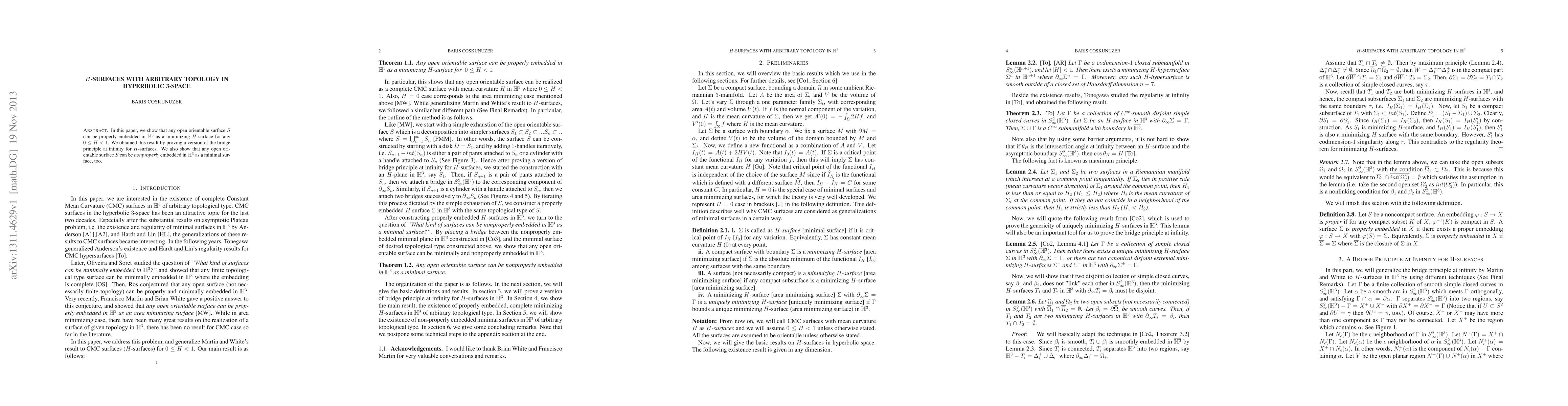 This research demonstrates that any open, orientable surface can be embedded in hyperbolic 3-space as a minimizing H-surface for H-values between 0 and 1 inclusive. It also proves that these surfaces can be non-properly embedded as minimal surfaces, achieved through a modified bridge principle at infinity for H-surfaces.