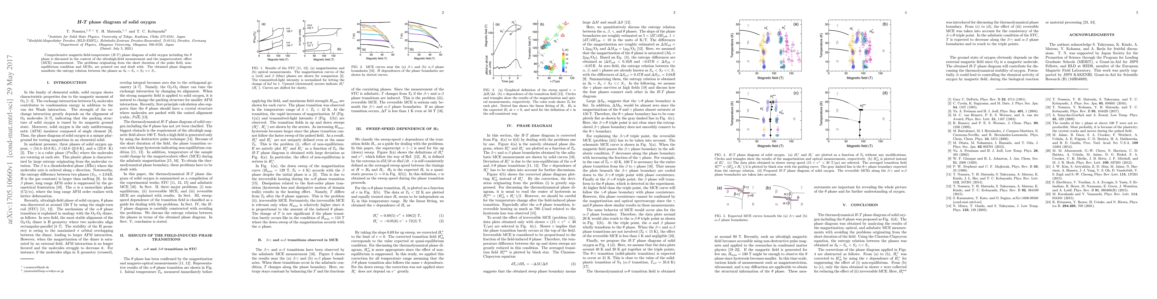 This study presents a comprehensive $H$-$T$ phase diagram for solid oxygen, including the $\theta$ phase, addressing challenges from ultrahigh-field measurements, non-equilibrium conditions, and magnetocaloric effects. The phase diagram reveals the entropy relationship $S_\theta \sim S_\alpha < S_\beta << S_\gamma$.