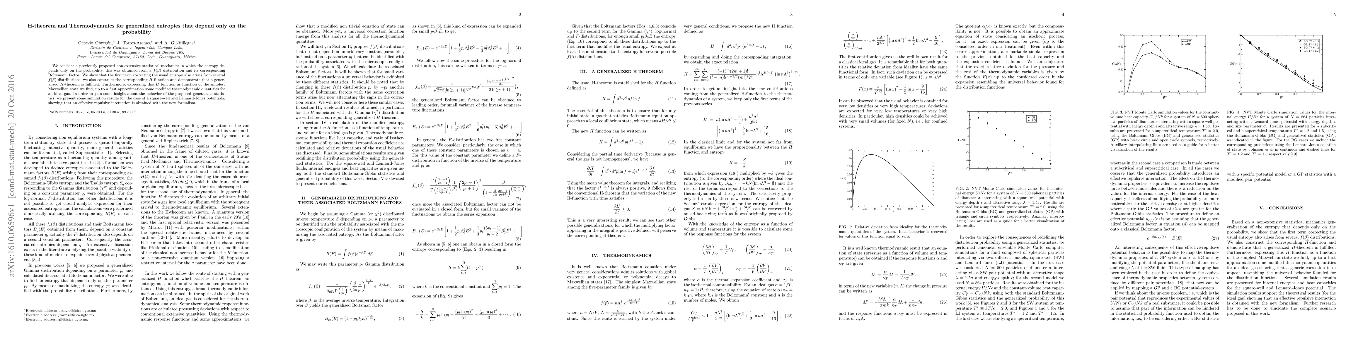 We consider a previously proposed non-extensive statistical mechanics in which the entropy depends only on the probability, this was obtained from a f(\beta) distribution and its corresponding Boltzmann factor. We show that the first term correcting the usual entropy also arises from several f(\beta) distributions, we also construct the corresponding H-function and demonstrate that a generalized H-theorem is fulfilled. Furthermore, expressing this H-function as function of the simplest Maxwellian state we find, up to a first approximation some modified thermodynamic quantities for an ideal gas. In order to gain some insight about the behavior of the proposed generalized statistics, we present some simulation results for the case of a square-well and Lennard-Jones potentials, showing that an effective repulsive interaction is obtained with the new formalism.