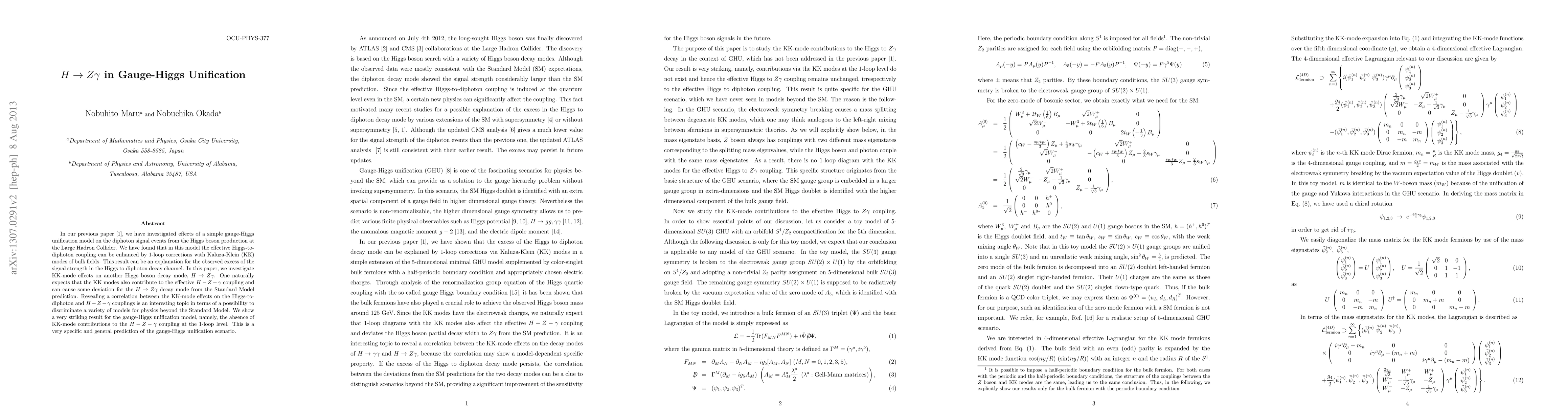 This paper investigates the effects of gauge-Higgs unification on the Higgs boson decay to Z gamma, finding no 1-loop contributions from Kaluza-Klein modes, contrasting with enhancements seen in the Higgs-to-diphoton decay. This specific prediction helps distinguish the gauge-Higgs unification model from others in physics beyond the Standard Model.