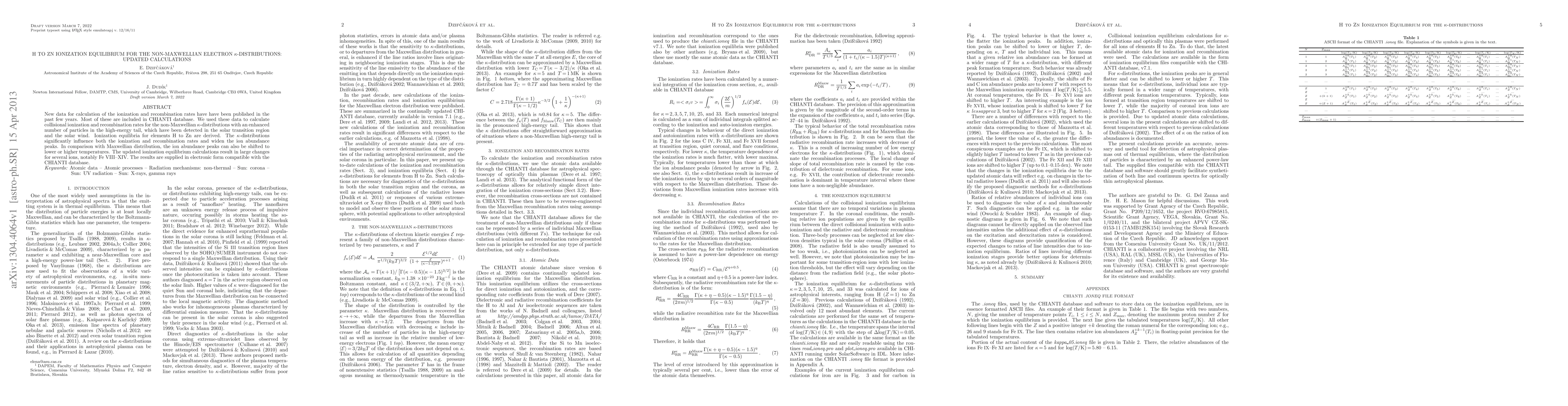 This paper updates ionization equilibrium calculations for elements from H to Zn using non-Maxwellian kappa-distributions, which have a higher number of high-energy particles. The results show significant differences in ionization and recombination rates compared to Maxwellian distributions, leading to shifts in ion abundance peaks and large changes in ions like Fe VIII--XIV.