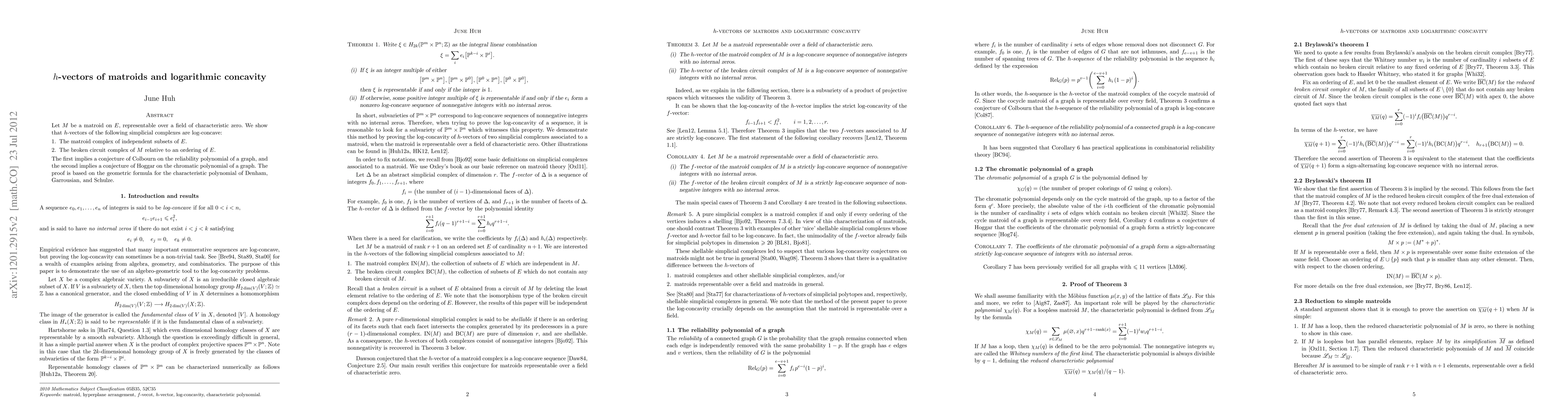 Let M be a matroid on E, representable over a field of characteristic zero. We show that h-vectors of the following simplicial complexes are log-concave: 1. The matroid complex of independent subsets of E. 2. The broken circuit complex of $M$ relative to an ordering of E. The first implies a conjecture of Colbourn on the reliability polynomial of a graph, and the second implies a conjecture of Hoggar on the chromatic polynomial of a graph. The proof is based on the geometric formula for the characteristic polynomial of Denham, Garrousian, and Schulze.