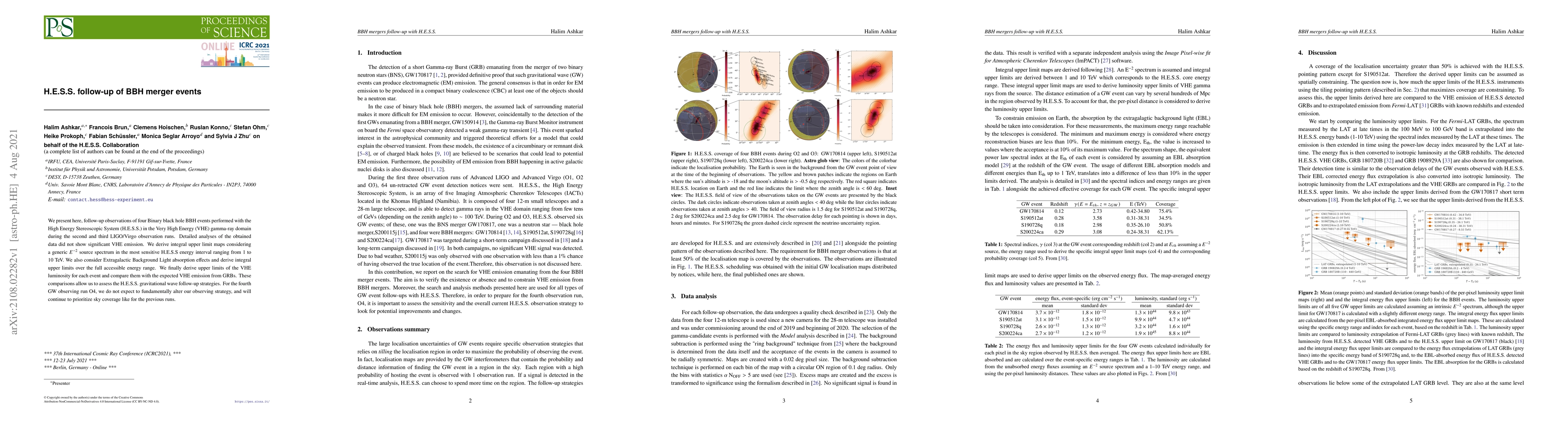 The H.E.S.S. follow-up observations of four Binary Black Hole merger events found no significant Very High Energy gamma-ray emission. The study sets upper limits on VHE luminosity and concludes that the current follow-up strategy will remain unchanged for the fourth observing run.