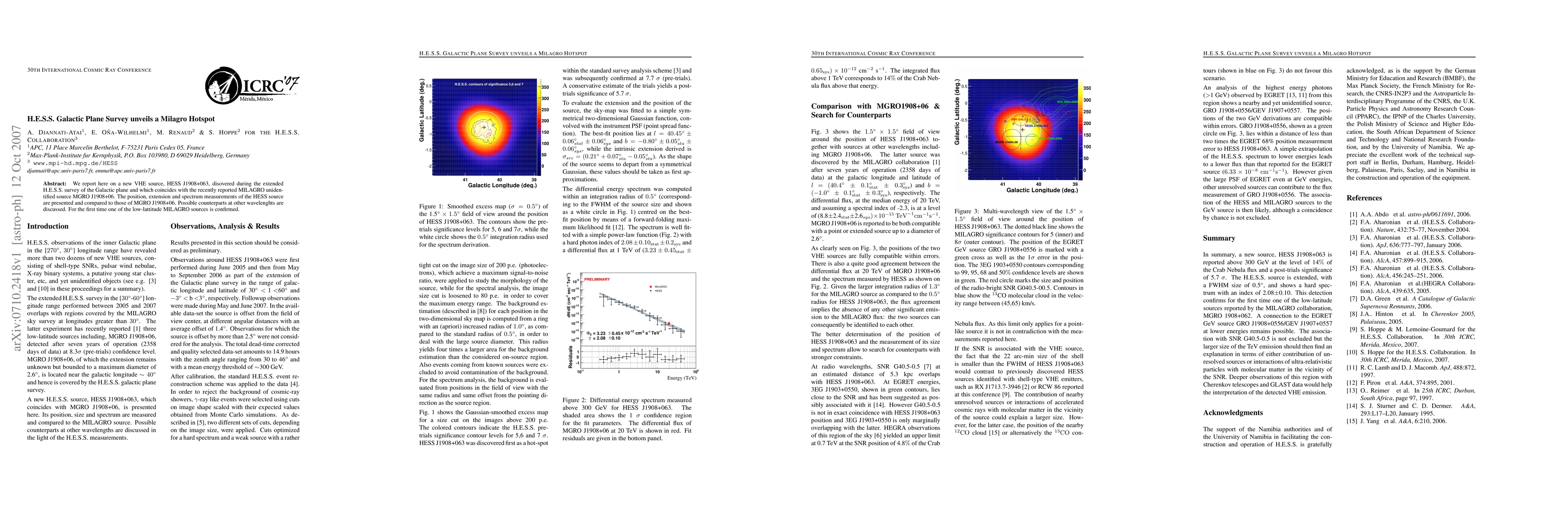 The H.E.S.S. Galactic Plane Survey has identified a new very high energy (VHE) source, HESS J1908+063, which matches the previously unidentified MILAGRO source MGRO J1908+06. This confirmation marks the first time a low-latitude MILAGRO source has been validated.