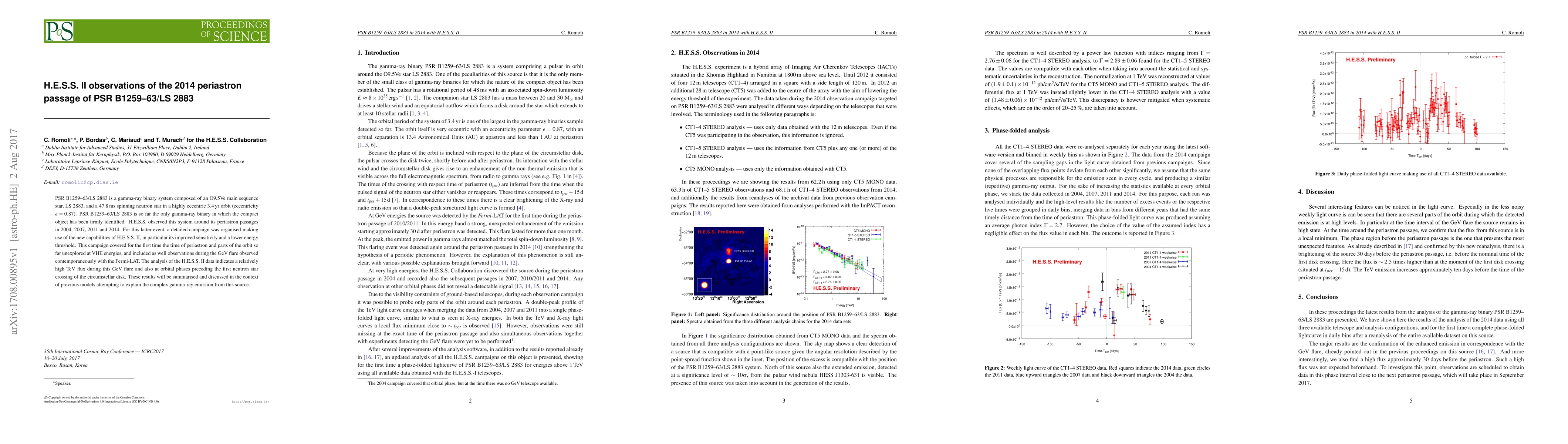 PSR B1259-63/LS 2883 is a gamma-ray binary system composed of an O9.5Ve main sequence star, LS 2883, and a 47.8 ms spinning neutron star in a highly eccentric 3.4 yr orbit (eccentricity e = 0.87). PSR B1259-63/LS 2883 is so far the only gamma-ray binary in which the compact object has been firmly identified. H.E.S.S. observed this system around its periastron passages in 2004, 2007, 2011 and 2014. For this latter event, a detailed campaign was organised making use of the new capabilities of H.E.S.S. II, in particular its improved sensitivity and a lower energy threshold. This campaign covered for the first time the time of periastron and parts of the orbit so far unexplored at VHE energies, and included as well observations during the GeV flare observed contemporaneously with the Fermi-LAT. The analysis of the H.E.S.S. II data indicates a relatively high TeV flux during this GeV flare and also at orbital phases preceding the first neutron star crossing of the circumstellar disk. These results will be summarised and discussed in the context of previous models attempting to explain the complex gamma-ray emission from this source.
