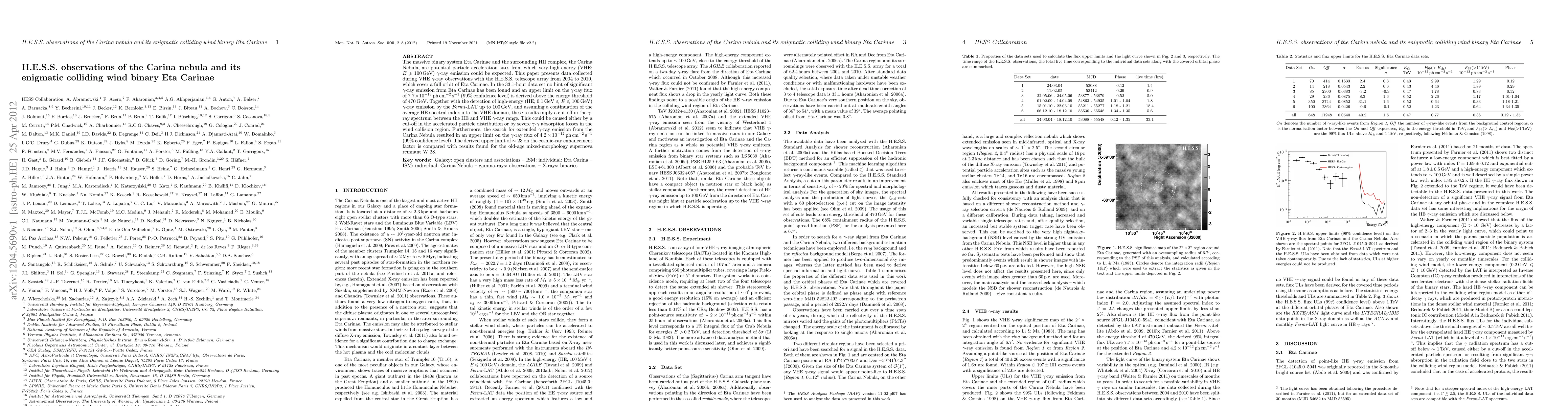 The massive binary system Eta Carinae and the surrounding HII complex, the Carina Nebula, are potential particle acceleration sites from which very-high-energy (VHE; E > 100 GeV) \gamma-ray emission could be expected. This paper presents data collected during VHE \gamma-ray observations with the H.E.S.S. telescope array from 2004 to 2010, which cover a full orbit of Eta Carinae. In the 33.1-hour data set no hint of significant \gamma-ray emission from Eta Carinae has been found and an upper limit on the \gamma-ray flux of 7.7 x 10-13 ph cm-2 s-1 (99% confidence level) is derived above the energy threshold of 470 GeV. Together with the detection of high-energy (HE; 0.1 GeV > E > 100 GeV) \gamma-ray emission by the Fermi-LAT up to 100 GeV, and assuming a continuation of the average HE spectral index into the VHE domain, these results imply a cut-off in the \gamma-ray spectrum between the HE and VHE \gamma-ray range. This could be caused either by a cut-off in the accelerated particle distribution or by severe \gamma-\gamma\ absorption losses in the wind collision region. Furthermore, the search for extended \gamma-ray emission from the Carina Nebula resulted in an upper limit on the \gamma-ray flux of 4.2 x 10-12 ph cm-2 s-1 (99% confidence level). The derived upper limit of ~23 on the cosmic-ray enhancement factor is compared with results found for the old-age mixed-morphology supernova remnant W 28.