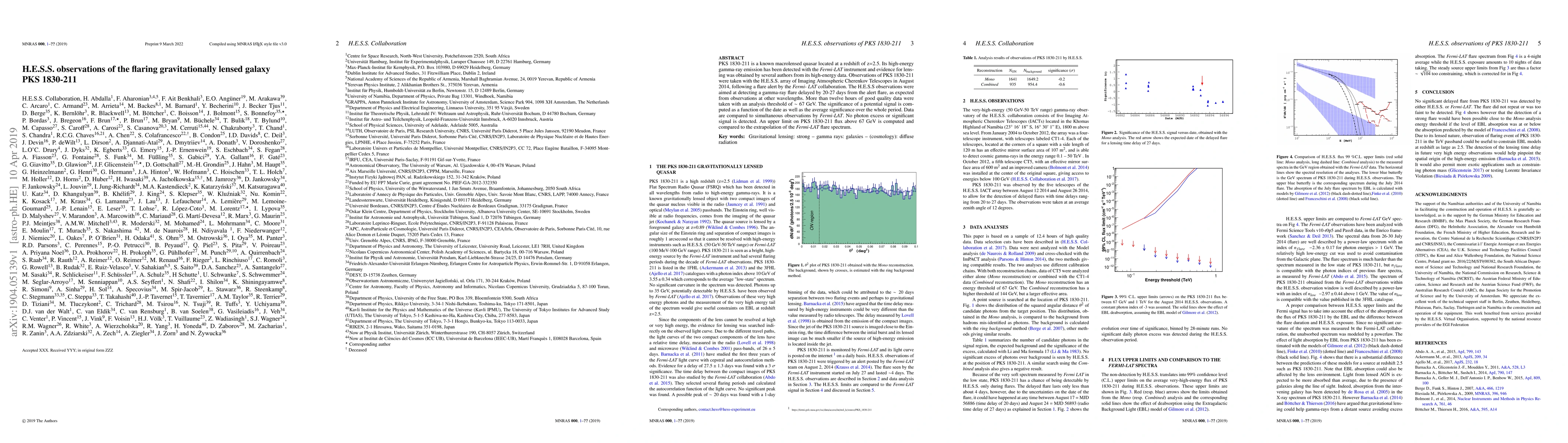 The H.E.S.S. observations of the gravitationally lensed quasar PKS 1830-211 following a Fermi-LAT flare detected no significant gamma-ray signal above 67 GeV, setting an upper limit on its flux and confirming the absence of a delayed gamma-ray flare.