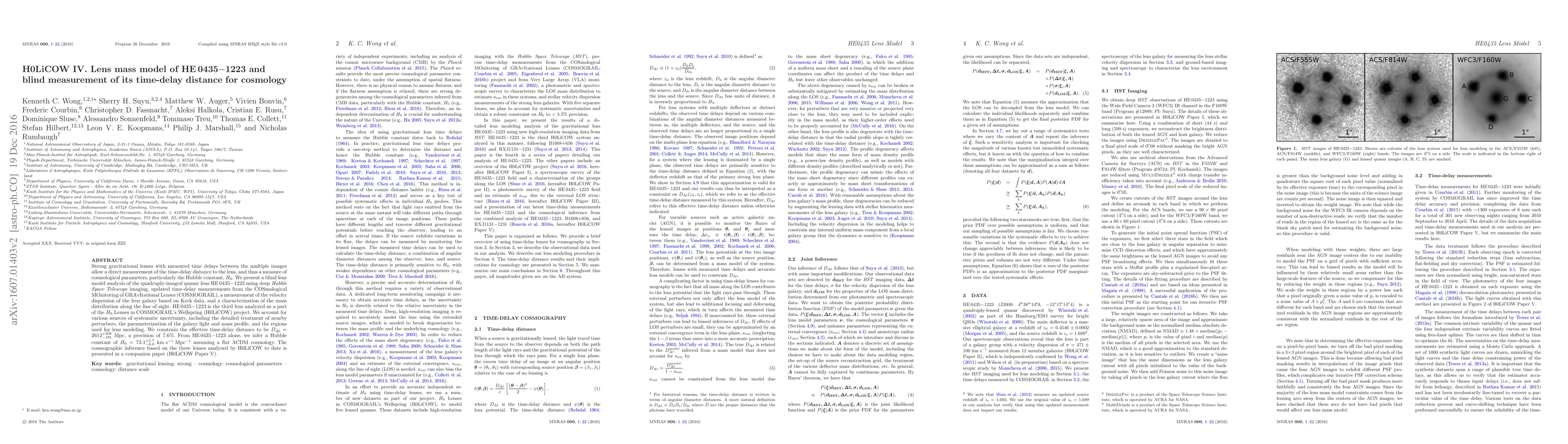 This paper presents a detailed lens model analysis of the quadruply-imaged quasar HE 0435-1223, using Hubble Space Telescope imaging and updated time-delay measurements to determine its time-delay distance. The analysis yields a Hubble constant of $H_{0} = 73.1_{-6.0}^{+5.7}~\mathrm{km~s^{-1}~Mpc^{-1}}$, contributing to the H0LiCOW project's efforts to refine cosmological parameters.