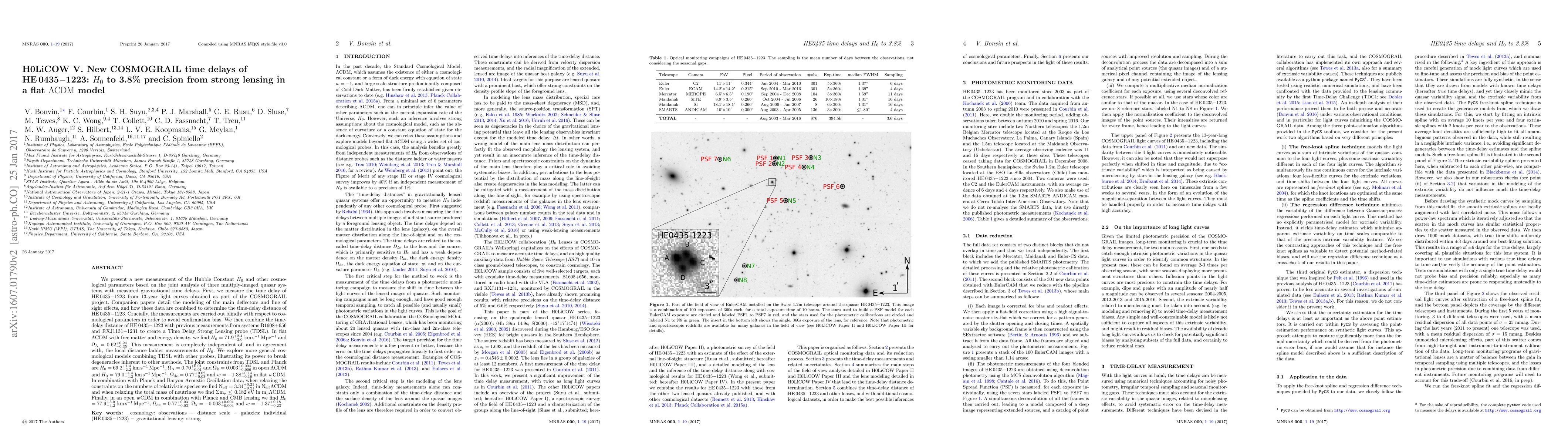 We present a new measurement of the Hubble Constant H0 and other cosmological parameters based on the joint analysis of three multiply-imaged quasar systems with measured gravitational time delays. First, we measure the time delay of HE0435-1223 from 13-year light curves obtained as part of the COSMOGRAIL project. Companion papers detail the modeling of the main deflectors and line of sight effects, and how these data are combined to determine the time-delay distance of HE 0435-1223. Crucially, the measurements are carried out blindly with respect to cosmological parameters in order to avoid confirmation bias. We then combine the time-delay distance of HE0435-1223 with previous measurements from systems B1608+656 and RXJ1131-1231 to create a Time Delay Strong Lensing probe (TDSL). In flat $\Lambda$CDM with free matter and energy density, we find $H_0$ = 71.9 +2.4 -3.0 km/s/Mpc and $\Omega_{\Lambda}$ = 0.62 +0.24 -0.35 . This measurement is completely independent of, and in agreement with, the local distance ladder measurements of H0. We explore more general cosmological models combining TDSL with other probes, illustrating its power to break degeneracies inherent to other methods. The TDSL and Planck joint constraints are $H_0$ = 69.2 +1.4 -2.2 km/s/Mpc, $\Omega_{\Lambda}$ = 0.70 +0.01 -0.01 and $\Omega_k$ = 0.003 +0.004 -0.006 in open $\Lambda$CDM and $H_0$ = 79.0 +4.4 -4.2 km/s/Mpc, $\Omega_{de}$ = 0.77 +0.02 -0.03 and $w$ = -1.38 +0.14 -0.16 in flat $w$CDM. Combined with Planck and Baryon Acoustic Oscillation data, when relaxing the constraints on the numbers of relativistic species we find $N_{eff}$ = 3.34 +0.21 -0.21 and when relaxing the total mass of neutrinos we find 0.182 eV. In an open $w$CDM in combination with Planck and CMB lensing we find $H_0$ = 77.9 +5.0 -4.2 km/s/Mpc, $\Omega_{de}$ = 0.77 +0.03 -0.03, $\Omega_k$ = -0.003 +0.004 -0.004 and $w$ = -1.37 +0.18 -0.23.