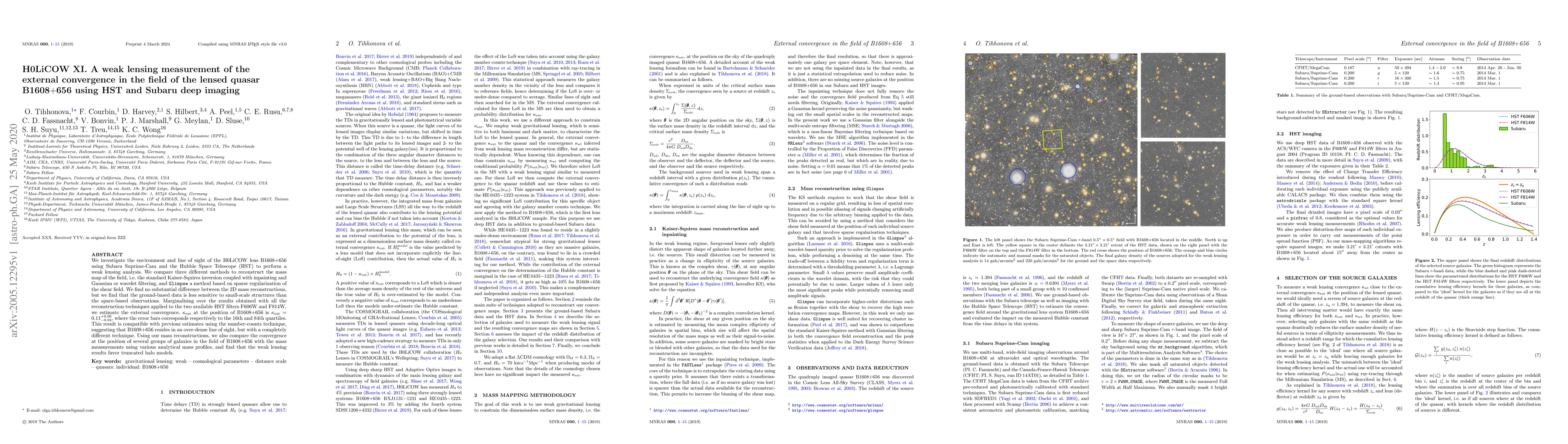 We investigate the environment and line of sight of the H0LiCOW lens B1608+656 using Subaru Suprime-Cam and the Hubble Space Telescope (HST) to perform a weak lensing analysis. We compare three different methods to reconstruct the mass map of the field, i.e. the standard Kaiser-Squires inversion coupled with inpainting and Gaussian or wavelet filtering, and $\tt{Glimpse}$ a method based on sparse regularization of the shear field. We find no substantial difference between the 2D mass reconstructions, but we find that the ground-based data is less sensitive to small-scale structures than the space-based observations. Marginalising over the results obtained with all the reconstruction techniques applied to the two available HST filters F606W and F814W, we estimate the external convergence, $\kappa_{\rm ext}$ at the position of B1608+656 is $\kappa_{\rm ext} = 0.11^{+0.06}_{-0.04}$, where the error bars corresponds respectively to the 16th and 84th quartiles. This result is compatible with previous estimates using the number-counts technique, suggesting that B1608+656 resides in an over-dense line of sight, but with a completely different technique. Using our mass reconstructions, we also compare the convergence at the position of several groups of galaxies in the field of B1608+656 with the mass measurements using various analytical mass profiles, and find that the weak lensing results favor truncated halo models.