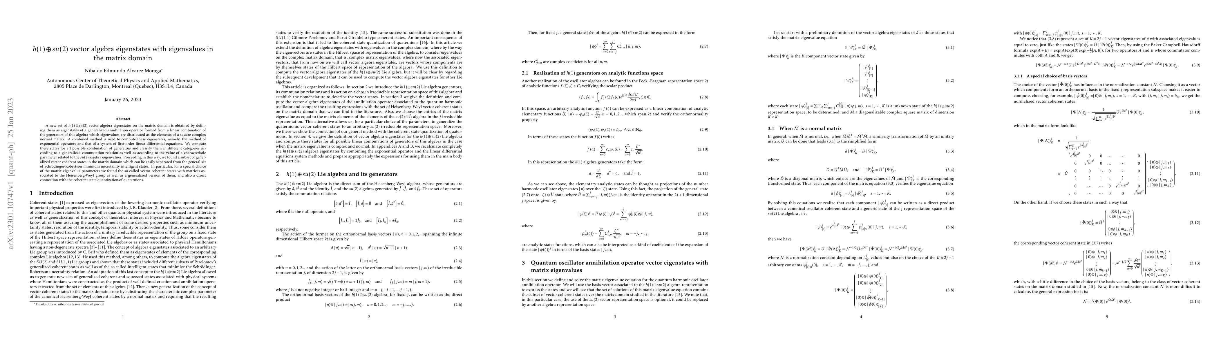 This paper introduces a new set of $h(1) \oplus su(2)$ vector algebra eigenstates on the matrix domain, computed using exponential operators and differential equations. It also identifies a subset of generalized vector coherent states linked to the Heisenberg-Weyl group and quaternions.