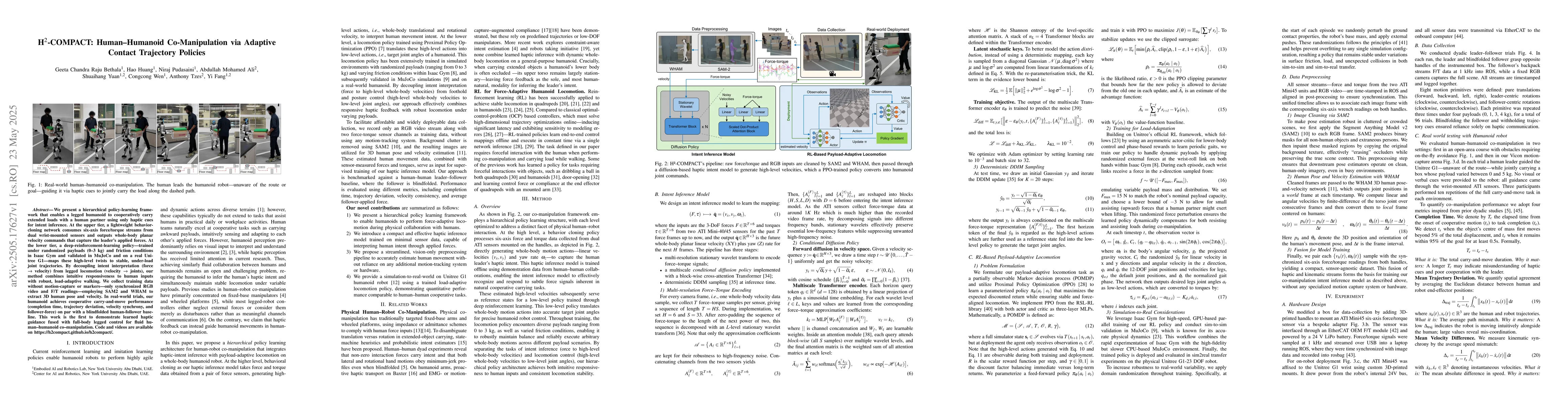 We present a hierarchical policy-learning framework that enables a legged humanoid to cooperatively carry extended loads with a human partner using only haptic cues for intent inference. At the upper tier, a lightweight behavior-cloning network consumes six-axis force/torque streams from dual wrist-mounted sensors and outputs whole-body planar velocity commands that capture the leader's applied forces. At the lower tier, a deep-reinforcement-learning policy, trained under randomized payloads (0-3 kg) and friction conditions in Isaac Gym and validated in MuJoCo and on a real Unitree G1, maps these high-level twists to stable, under-load joint trajectories. By decoupling intent interpretation (force -> velocity) from legged locomotion (velocity -> joints), our method combines intuitive responsiveness to human inputs with robust, load-adaptive walking. We collect training data without motion-capture or markers, only synchronized RGB video and F/T readings, employing SAM2 and WHAM to extract 3D human pose and velocity. In real-world trials, our humanoid achieves cooperative carry-and-move performance (completion time, trajectory deviation, velocity synchrony, and follower-force) on par with a blindfolded human-follower baseline. This work is the first to demonstrate learned haptic guidance fused with full-body legged control for fluid human-humanoid co-manipulation. Code and videos are available on the H2-COMPACT website.