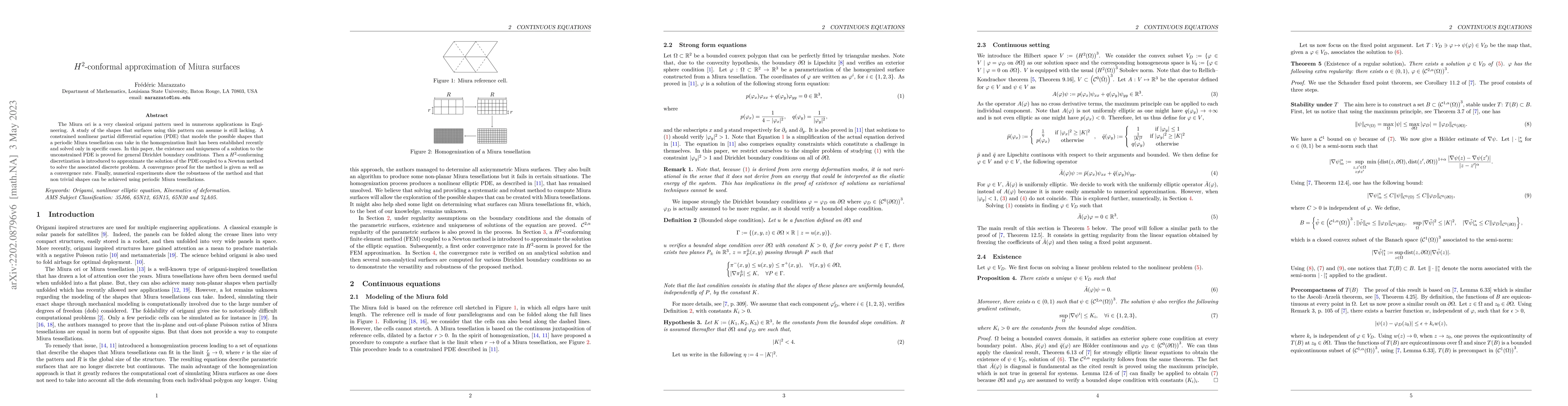 This paper proves the existence and uniqueness of solutions to an unconstrained PDE modeling periodic Miura tessellation shapes, introduces an $H^2$-conforming discretization method, and demonstrates its convergence and robustness through numerical experiments.
