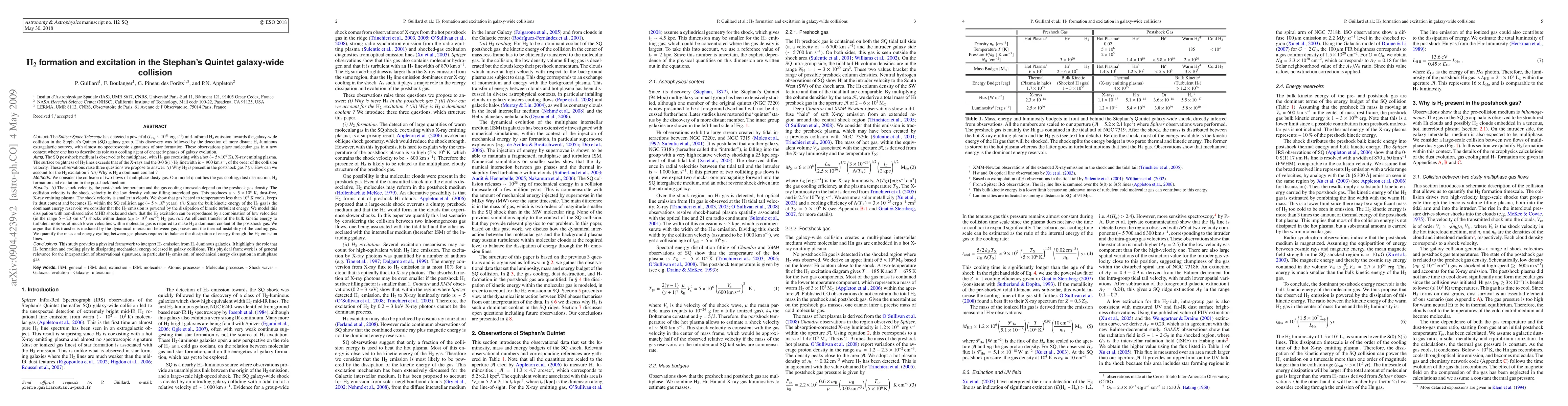Context. The Spitzer Space Telescope has detected a powerful (L(H2)~10^41 erg s-1) mid-infrared H2 emission towards the galaxy-wide collision in the Stephan's Quintet (SQ) galaxy group. This discovery was followed by the detection of more distant H2-luminous extragalactic sources, with almost no spectroscopic signatures of star formation. These observations set molecular gas in a new context where one has to describe its role as a cooling agent of energetic phases of galaxy evolution. Aims. The SQ postshock medium is observed to be multiphase, with H2 gas coexisting with a hot (~ 5 10^6 K), X-ray emitting plasma. The surface brightness of H2 lines exceeds that of the X-rays and the 0-0 S(1) H2 linewidth is ~ 900 km s-1, of the same order of the collision velocity. These observations raise three questions we propose to answer: (i) Why H2 is present in the postshock gas ? (ii) How can we account for the H2 excitation ? (iii) Why H2 is a dominant coolant ? Methods. We consider the collision of two flows of multiphase dusty gas. Our model quantifies the gas cooling, dust destruction, H2 formation and excitation in the postshock medium. Results. (i) The shock velocity, the post-shock temperature and the gas cooling timescale depend on the preshock gas density. The collision velocity is the shock velocity in the low density volume filling intercloud gas. This produces a ~ 5 10^6 K, dust-free, X-ray emitting plasma. The shock velocity is smaller in clouds. We show that gas heated to temperatures less than 10^6 K cools, keeps its dust content and becomes H2 within the SQ collision age (~ 5 10^6 years). (ii) Since the bulk kinetic energy of the H2 gas is the dominant energy reservoir, we consider that the H2 emission is powered by the dissipation of kinetic turbulent energy. (Abridged)