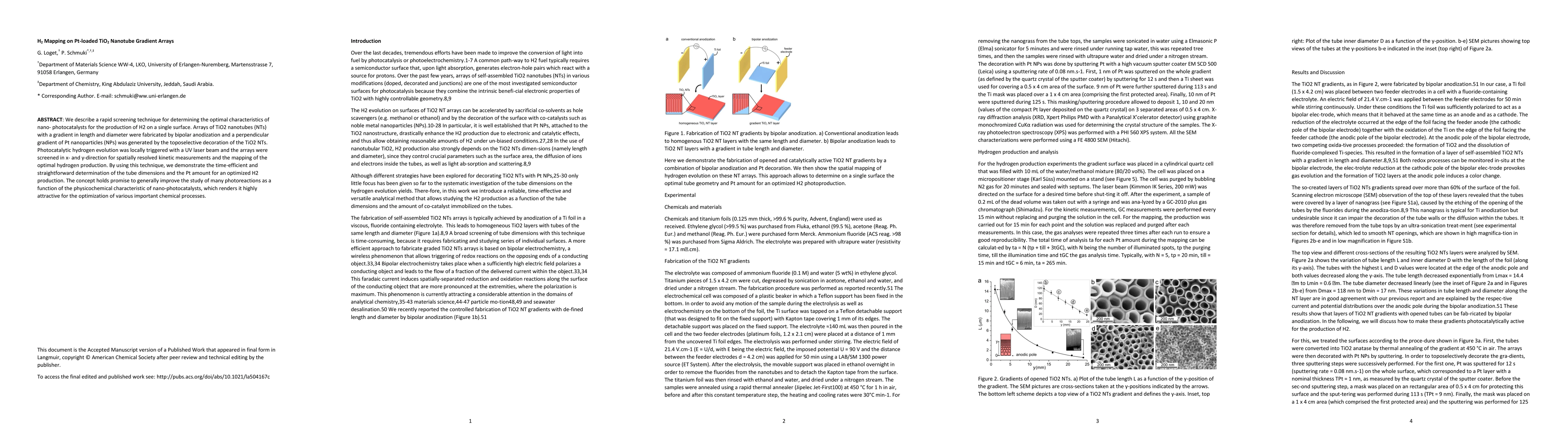 We describe a rapid screening technique for determining the optimal characteristics of nano- photocatalysts for the production of H2 on a single surface. Arrays of TiO2 nanotubes (NTs) with a gradient in length and diameter were fabricated by bipolar anodization and a perpendicular gradient of Pt nanoparticles (NPs) was generated by the toposelective decoration of the TiO2 NTs. Photocatalytic hydrogen evolution was locally triggered with a UV laser beam and the arrays were screened in x- and y-direction for spatially resolved kinetic measurements and the mapping of the optimal hydrogen production. By using this technique, we demonstrate the time-efficient and straightforward determination of the tube dimensions and the Pt amount for an optimized H2 production. The concept holds promise to generally improve the study of many photoreactions as a function of the physicochemical characteristic of nano-photocatalysts, which renders it highly attractive for the optimization of various important chemical processes.