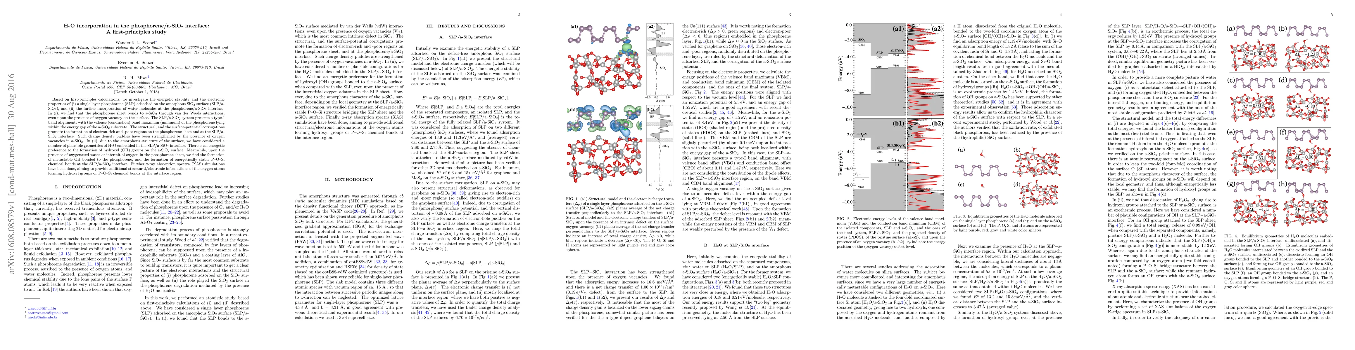 Based on first-principles calculations, we investigate the energetic stability and the electronic properties of (i) a single layer phosphorene (SLP) adsorbed on the amorphous sio2 surface (SLP/a-sio2), and (ii) the further incorporation of water molecules at the phosphorene/a-sio2 interface. In (i), we find that the phosphorene sheet bonds to a-sio2 through van der Waals interactions, even upon the presence of oxygen vacancy on the surface. The \slp/a-\sio\ system presents a type-I band alignment, with the valence (conduction) band maximum (minimum) of the phosphorene lying within the energy gap of the a-\sio\ substrate. The structural, and the surface-potential corrugations promote the formation of electron-rich and -poor regions on the phosphorene sheet and at the SLP/a-sio2 interface. Such charge density puddles have been strengthened by the presence of oxygen vacancies in a-sio2. In (ii), due to the amorphous structure of the surface, we have considered a number of plausible geometries of water embedded in the SLP/a-sio2 interface. There is an energetic preference to the formation of hydroxyl (OH) groups on the a-sio2 surface. Meanwhile, upon the presence of oxygenated water or interstitial oxygen in the phosphorene sheet, we find the formation of metastable OH bonded to the phosphorene, and the formation of energetically stable P--O--Si chemical bonds at the SLP/a-sio2 interface. Further x-ray absorption spectra (XAS) simulations have been done, aiming to provide additional structural/electronic informations of the oxygen atoms forming hydroxyl groups or P--O--Si chemical bonds at the interface region.