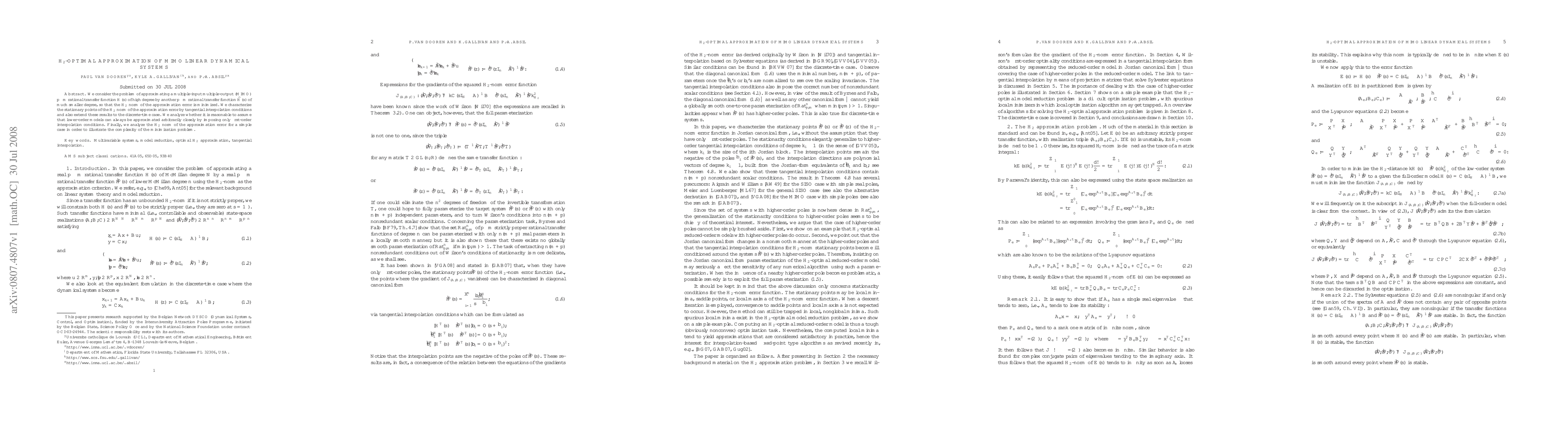 We consider the problem of approximating a multiple-input multiple-output (MIMO) $p\times m$ rational transfer function $H(s)$ of high degree by another $p\times m$ rational transfer function $\hat H(s)$ of much smaller degree, so that the ${\cal H}_2$ norm of the approximation error is minimized. We characterize the stationary points of the ${\cal H}_2$ norm of the approximation error by tangential interpolation conditions and also extend these results to the discrete-time case. We analyze whether it is reasonable to assume that lower-order models can always be approximated arbitrarily closely by imposing only first-order interpolation conditions. Finally, we analyze the ${\cal H}_2$ norm of the approximation error for a simple case in order to illustrate the complexity of the minimization problem.