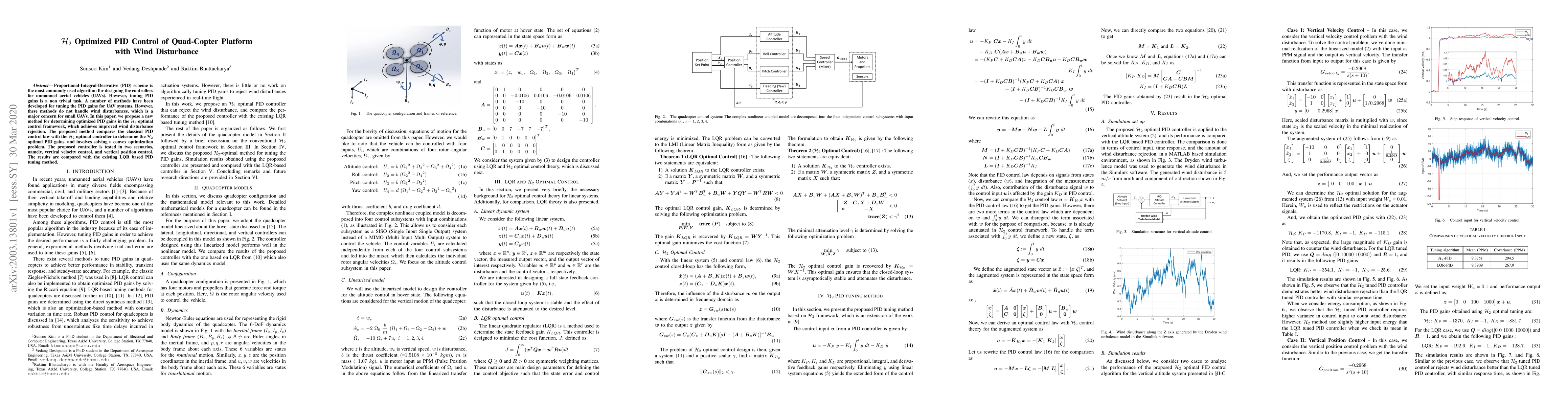 This paper proposes an H2 optimal PID control method for quad-copter UAVs to improve wind disturbance rejection. The method determines optimized PID gains by comparing classical PID control with H2 optimal control, solving a convex optimization problem, and is tested in vertical velocity and position control scenarios.