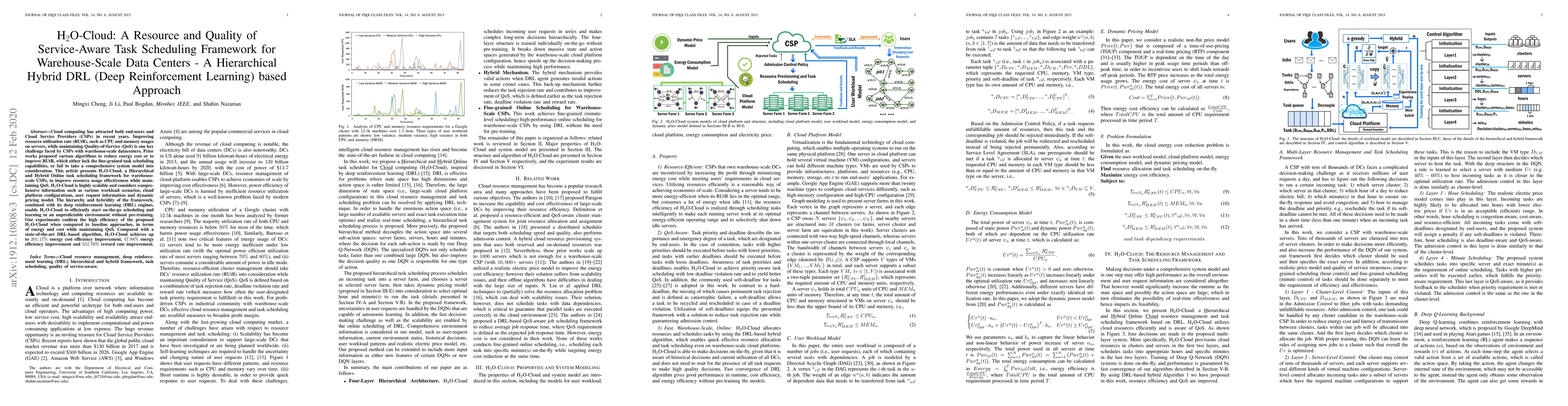 H2O-Cloud is a hierarchical hybrid DRL-based task scheduling framework designed to optimize resource utilization and maintain Quality of Service in warehouse-scale data centers. It leverages deep reinforcement learning for scalable, adaptive scheduling without pre-training, achieving significant improvements in energy efficiency and cost compared to baseline methods.