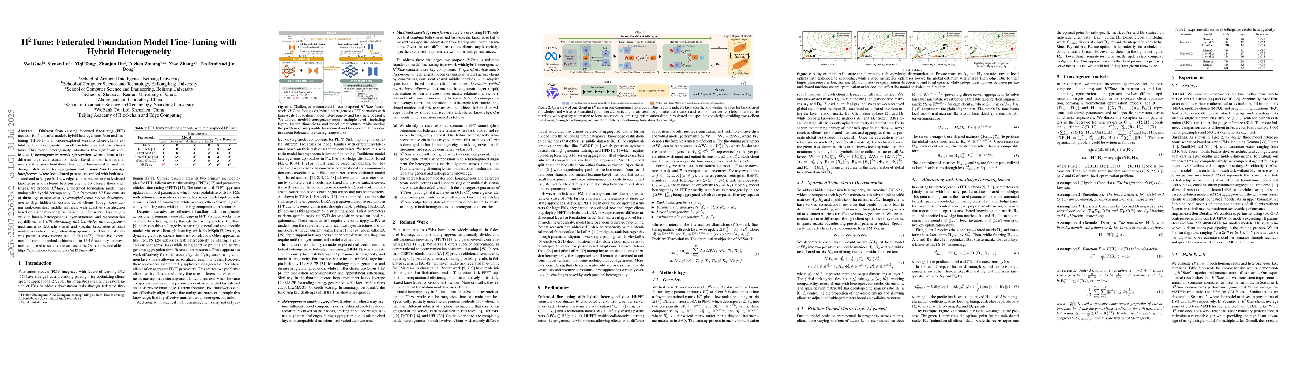 H2Tune introduces sparsified triple matrix decomposition, relation-guided matrix layer alignment, and alternating task-knowledge disentanglement mechanisms to address the challenges of hybrid heterogeneity in federated fine-tuning.