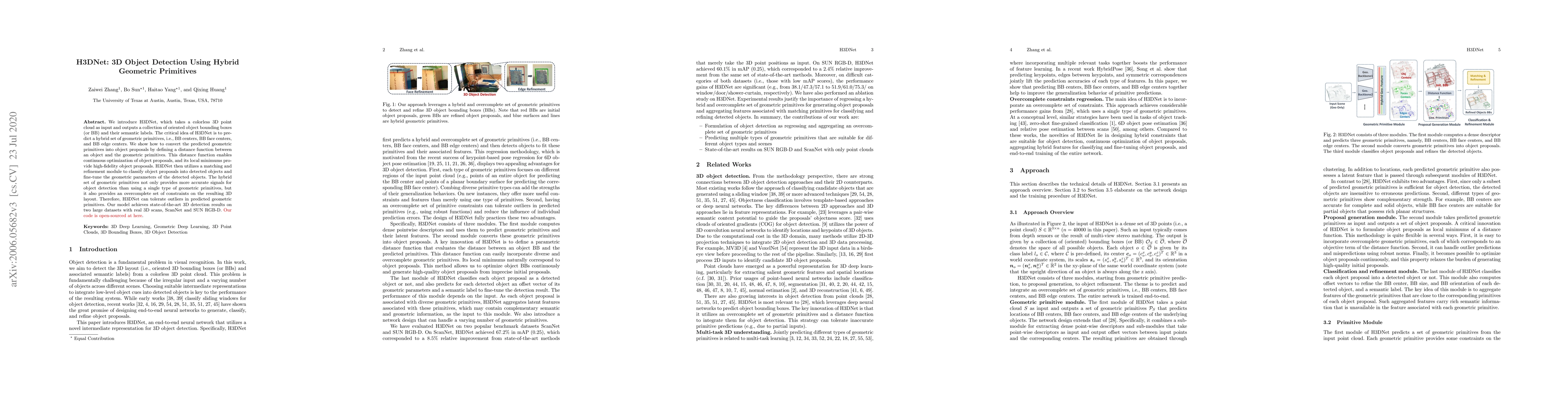 H3DNet employs a hybrid set of geometric primitives—BB centers, face centers, and edge centers—to detect 3D objects from point clouds, achieving state-of-the-art results on ScanNet and SUN RGB-D datasets. The method optimizes object proposals using a distance function and refines detections through a matching and classification module.