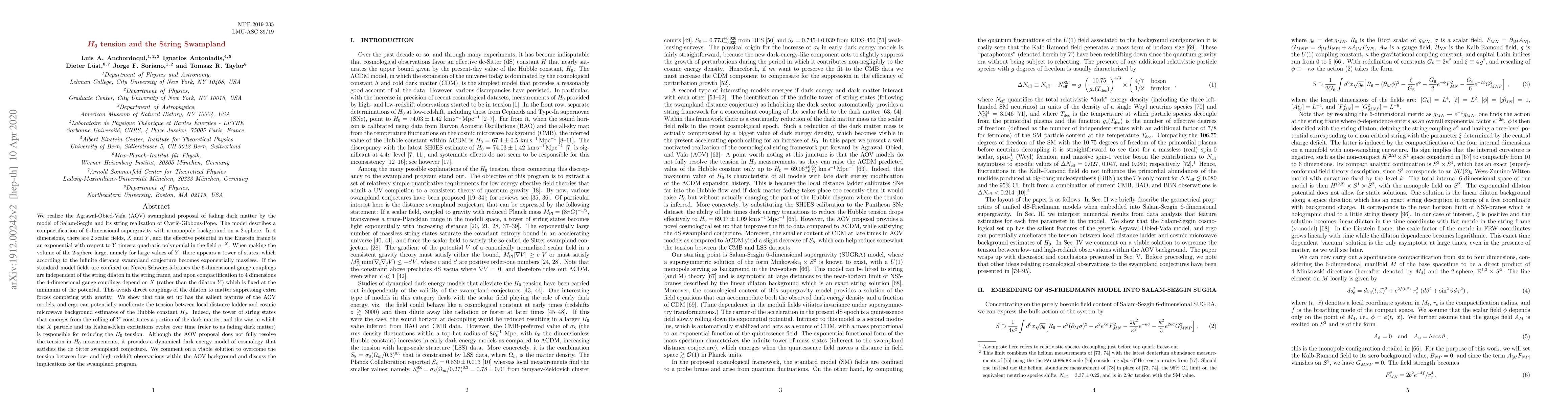[Abridged] We realize the Agrawal-Obied-Vafa (AOV) swampland proposal of fading dark matter by the model of Salam-Sezgin and its string realization of Cvetic-Gibbons-Pope. The model describes a compactification of 6-dimensional supergravity with a monopole background on a 2-sphere. In 4 dimensions, there are 2 scalar fields, $X$ and $Y $, and the effective potential in the Einstein frame is an exponential with respect to $Y$ times a quadratic polynomial in the field $e^{-X}$. When making the volume of the 2-sphere large, namely for large values of $Y$, there appears a tower of states, which according to the infinite distance swampland conjecture becomes exponentially massless. If the standard model fields are confined on Neveu-Schwarz 5-branes the 6-dimensional gauge couplings are independent of the string dilaton in the string frame, and upon compactification to 4 dimensions the 4-dimensional gauge couplings depend on $X$ (rather than the dilaton $Y$) which is fixed at the minimum of the potential. This avoids direct couplings of the dilaton to matter suppressing extra forces competing with gravity. We show that this set up has the salient features of the AOV models, and ergo can potentially ameliorate the tension between local distance ladder and cosmic microwave background estimates of the Hubble constant $H_0$. Although the AOV proposal does not fully resolve the tension in $H_0$ measurements, it provides a dynamical dark energy model of cosmology that satisfies the de Sitter swampland conjecture. We comment on a viable solution to overcome the tension between low- and high-redshift observations within the AOV background and discuss the implications for the swampland program.