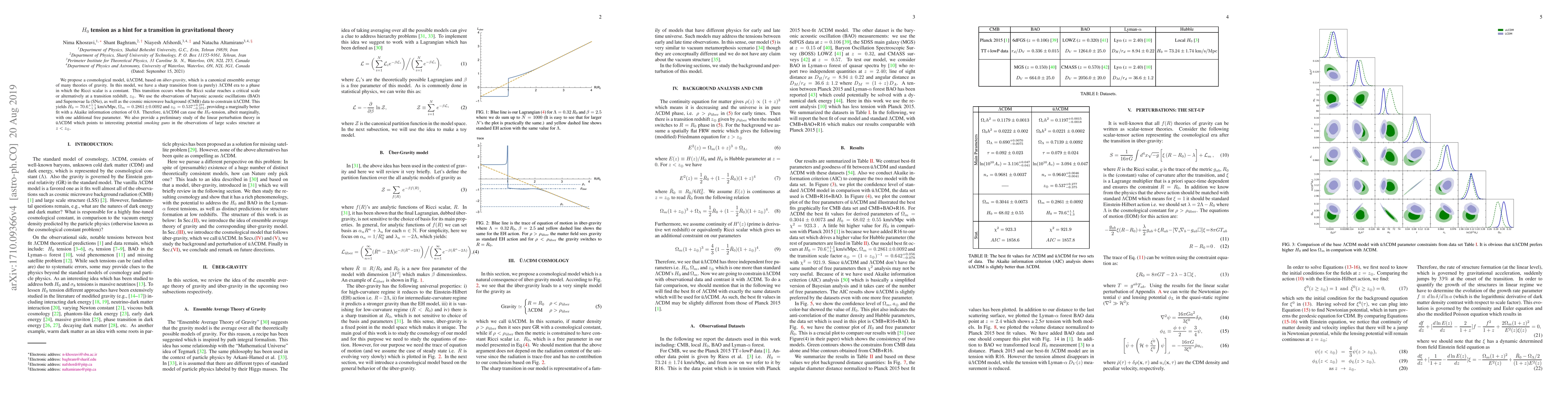We propose a cosmological model, \"u$\Lambda$CDM, based on {\it \"uber-gravity}, which is a canonical ensemble average of many theories of gravity. In this model, we have a sharp transition from (a purely) $\Lambda$CDM era to a phase in which the Ricci scalar is a constant. This transition occurs when the Ricci scalar reaches a critical scale or alternatively at a transition redshift, $z_\oplus$. We use the observations of baryonic acoustic oscillations (BAO) and Supernovae Ia (SNe), as well as the cosmic microwave background (CMB) data to constrain \"u$\Lambda$CDM. This yields $H_0=70.6_{-1.3}^{+1.1}$ km/s/Mpc, $\Omega_m=0.2861 \pm{0.0092} $ and $z_\oplus=0.537_{-0.375}^{+0.277}$, providing a marginally better fit with a Akaike information criterion of 0.8. %After adding in the data from BAO in the Lyman-$\alpha$ forest in quasar spectra, we get $\Delta\chi^2=-2.14$, where the best fit occurs at $H_0=71.2_{-1.5}^{+1.8}$ km/s/Mpc, $\Omega_m=0.280\pm 0.013$ and $z_{\oplus}= 0.41^{+0.31}_{-0.29}$. Therefore, \"u$\Lambda$CDM can ease the $H_0$-tension, albeit marginally, with one additional free parameter. We also provide a preliminary study of the linear perturbation theory in \"u$\Lambda$CDM which points to interesting potential {\it smoking guns} in the observations of large scales structure at $z < z_{\oplus}$.