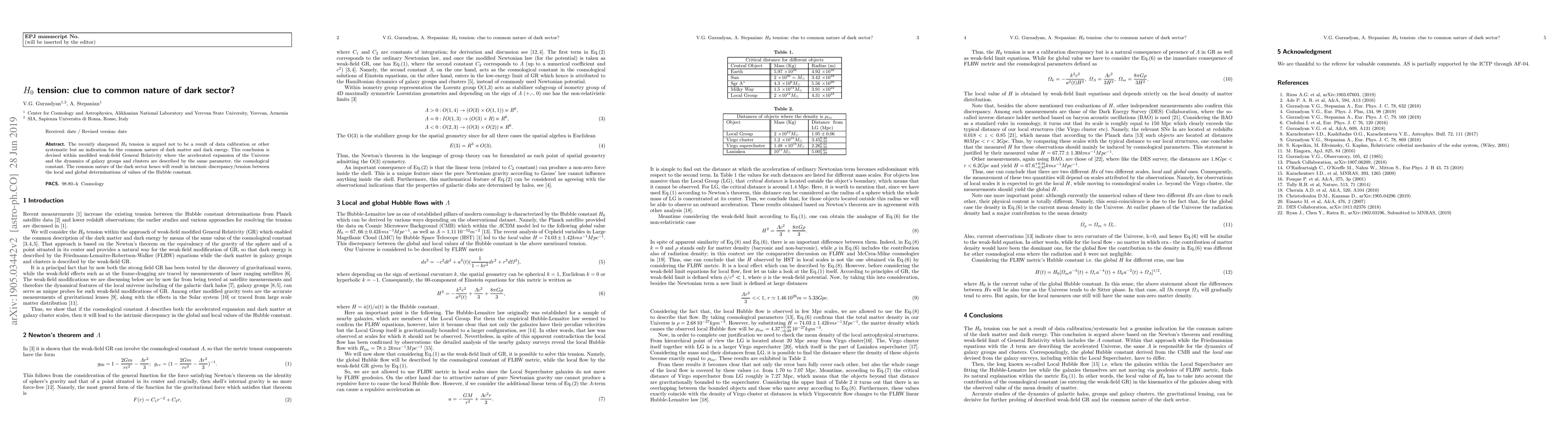 The recently sharpened H_0 tension is argued not to be a result of data calibration or other systematic but an indication for the common nature of dark matter and dark energy. This conclusion is devised within modified weak-field General Relativity where the accelerated expansion of the Universe and the dynamics of galaxy groups and clusters are described by the same parameter, the cosmological constant. The common nature of the dark sector hence will result in intrinsic discrepancy/tension between the local and global determinations of values of the Hubble constant.