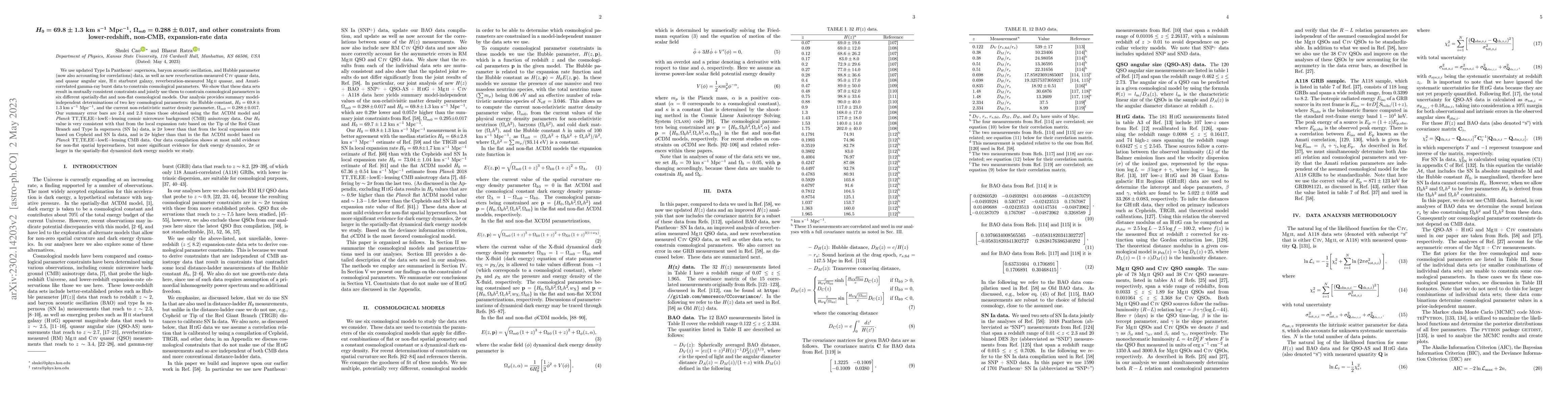 We use updated Type Ia Pantheon+ supernova, baryon acoustic oscillation, and Hubble parameter (now also accounting for correlations) data, as well as new reverberation-measured C IV quasar data, and quasar angular size, H II starburst galaxy, reverberation-measured Mg II quasar, and Amati-correlated gamma-ray burst data to constrain cosmological parameters. We show that these data sets result in mutually consistent constraints and jointly use them to constrain cosmological parameters in six different spatially-flat and non-flat cosmological models. Our analysis provides summary model-independent determinations of two key cosmological parameters: the Hubble constant, $H_0=69.8\pm1.3$ $\rm{km \ s^{-1} \ Mpc^{-1}}$, and the current non-relativistic matter density parameter, $\Omega_{m0}=0.288\pm0.017$. Our summary error bars are 2.4 and 2.3 times those obtained using the flat $\Lambda$CDM model and Planck TT,TE,EE+lowE+lensing cosmic microwave background (CMB) anisotropy data. Our $H_0$ value is very consistent with that from the local expansion rate based on the Tip of the Red Giant Branch data, is 2$\sigma$ lower than that from the local expansion rate based on Type Ia supernova and Cepheid data, and is 2$\sigma$ higher than that in the flat $\Lambda$CDM model based on Planck TT,TE,EE+lowE+lensing CMB data. Our data compilation shows at most mild evidence for non-flat spatial hypersurfaces, but more significant evidence for dark energy dynamics, 2$\sigma$ or larger in the spatially-flat dynamical dark energy models we study.