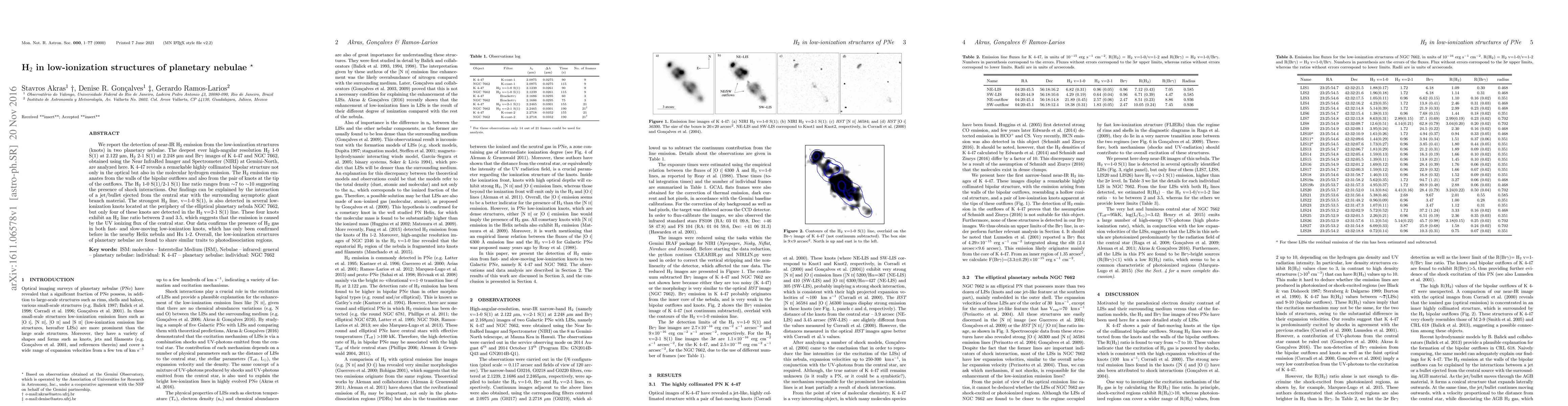This study reports the detection of near-IR H$_2$ emission in low-ionization structures of two planetary nebulae, K 4-47 and NGC 7662, revealing shock interactions and suggesting jet/bullet interactions with surrounding material. The findings indicate H$_2$ gas presence in both fast- and slow-moving knots, akin to photodissociation regions.