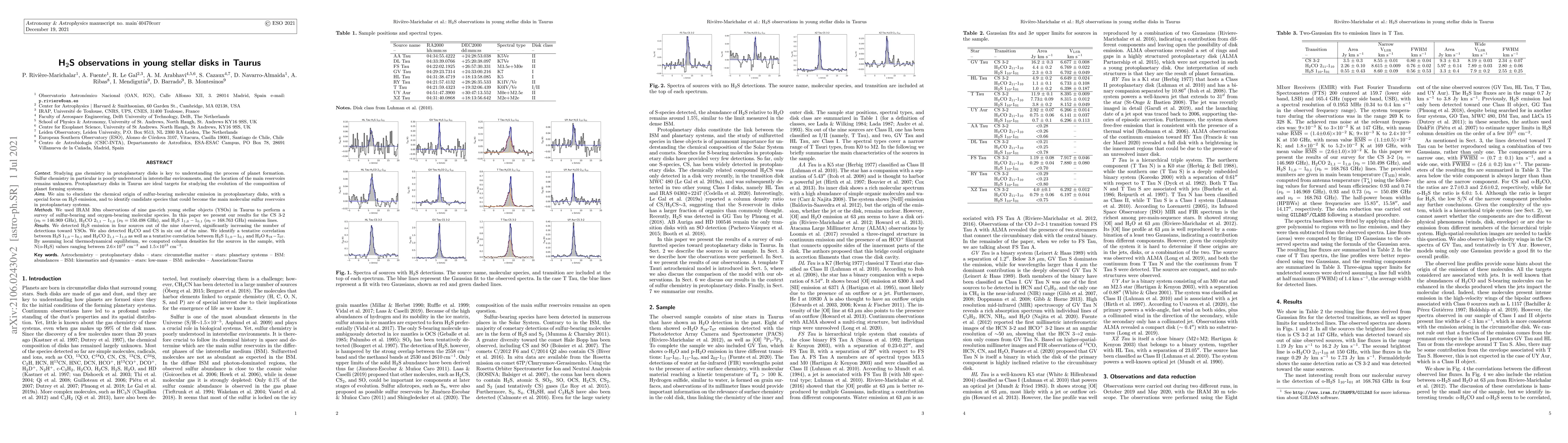 Context. Studying gas chemistry in protoplanetary disks is key to understanding the process of planet formation. Sulfur chemistry in particular is poorly understood in interstellar environments, and the location of the main reservoirs remains unknown. Protoplanetary disks in Taurus are ideal targets for studying the evolution of the composition of planet forming systems. Aims. We aim to elucidate the chemical origin of sulfur-bearing molecular emission in protoplanetary disks, with a special focus on H$_2$S emission, and to identify candidate species that could become the main molecular sulfur reservoirs in protoplanetary systems. Methods. We used IRAM 30m observations of nine gas-rich young stellar objects (YSOs) in Taurus to perform a survey of sulfur-bearing and oxygen-bearing molecular species. In this paper we present our results for the CS 3-2 ($\nu_0$ = 146.969 GHz), H$_2$CO 2$_{11}$-1$_{10}$ ($\nu_0$ = 150.498 GHz), and H$_2$S 1$_{10}$-1$_{01}$ ($\nu_0$ = 168,763 GHz) emission lines. Results. We detected H$_2$S emission in four sources out of the nine observed, significantly increasing the number of detections toward YSOs. We also detected H$_2$CO and CS in six out of the nine. We identify a tentative correlation between H$_2$S 1$_{10}$-1$_{01}$ and H$_2$CO 2$_{11}$-1$_{10}$ as well as a tentative correlation between H$_2$S 1$_{10}$-1$_{01}$ and H$_2$O 8$_{18}$-7$_{07}$. By assuming local thermodynamical equilibrium, we computed column densities for the sources in the sample, with N(o-H$_2$S) values ranging between $2.6\times10^{12}$ cm$^{-2}$ and $1.5\times10^{13}$ cm$^{-2}$.