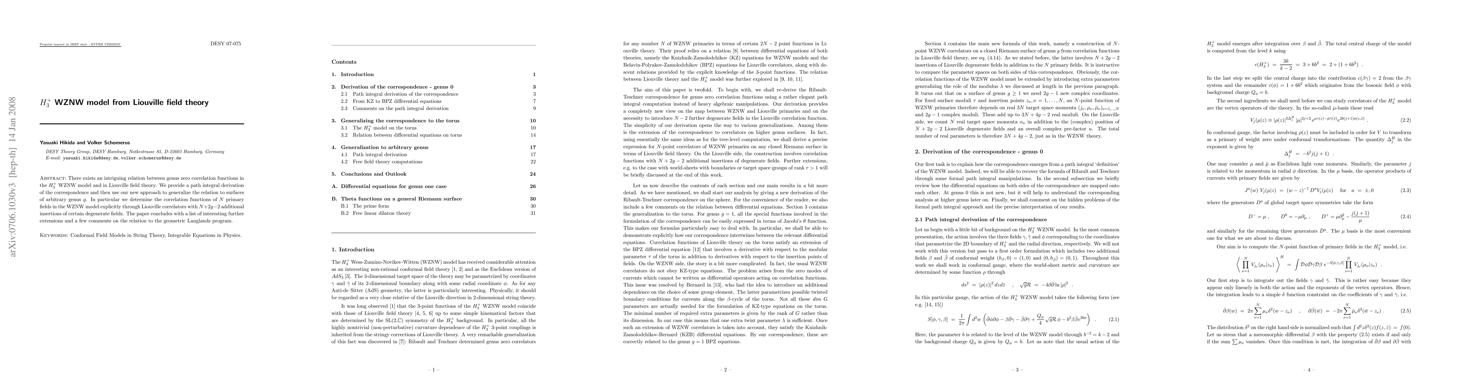 This paper establishes a path integral correspondence between genus zero correlation functions in the H^+_3 WZNW model and Liouville field theory, extending this relation to surfaces of arbitrary genus g. It explicitly determines WZNW model correlation functions via Liouville correlators with additional degenerate field insertions.