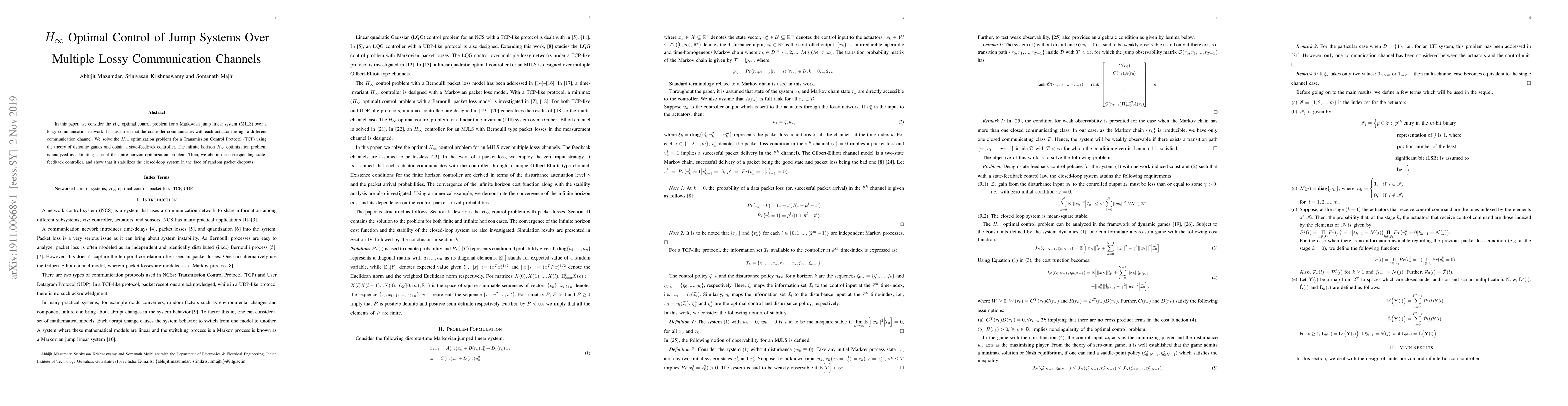 This paper addresses the $H_{\infty}$ optimal control problem for Markovian jump linear systems over lossy communication channels, developing a state-feedback controller using dynamic game theory for TCP. The proposed controller stabilizes the system despite random packet dropouts.