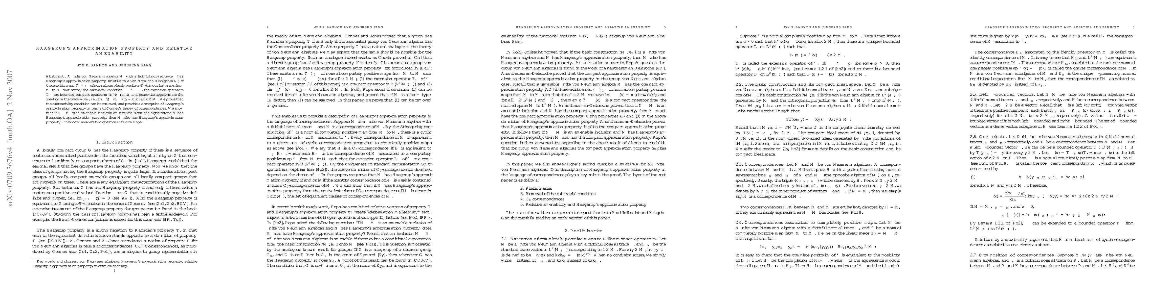 A finite von Neumann algebra $\mathcal{M}$ with a faithful normal trace $% \tau $ has Haagerup's approximation property (relative to a von Neumann subalgebra $\mathcal{N}$) if there exists a net $(\phi_{\alpha})_{\alpha\in \Lambda}$ of normal completely positive ($\mathcal{N}$-bimodular) maps from $\mathcal{M}$ to $\mathcal{M}$ that satisfy the subtracial condition $% \tau \circ \phi_{\alpha}\leq \tau $, the extension operators $% T_{\phi_{\alpha}}$ are bounded compact operators (in $<\mathcal{M%},e_{\mathcal{N}}>$), and pointwise approximate the identity in the trace-norm, i.e., $\lim_{\alpha}||\phi_{\alpha}(x)-x||_{2}=0$ for all $% x\in \mathcal{M}$. We prove that the subtraciality condition can be removed, and provide a description of Haagerup's approximation property in terms of Connes's theory of correspondences. We show that if $\mathcal{N}\subseteq \mathcal{M}$ is an amenable inclusion of finite von Neumann algebras and $% \mathcal{N}$ has Haagerup's approximation property, then $\mathcal{M}$ also has Haagerup's approximation property. This work answers two questions of Sorin Popa.