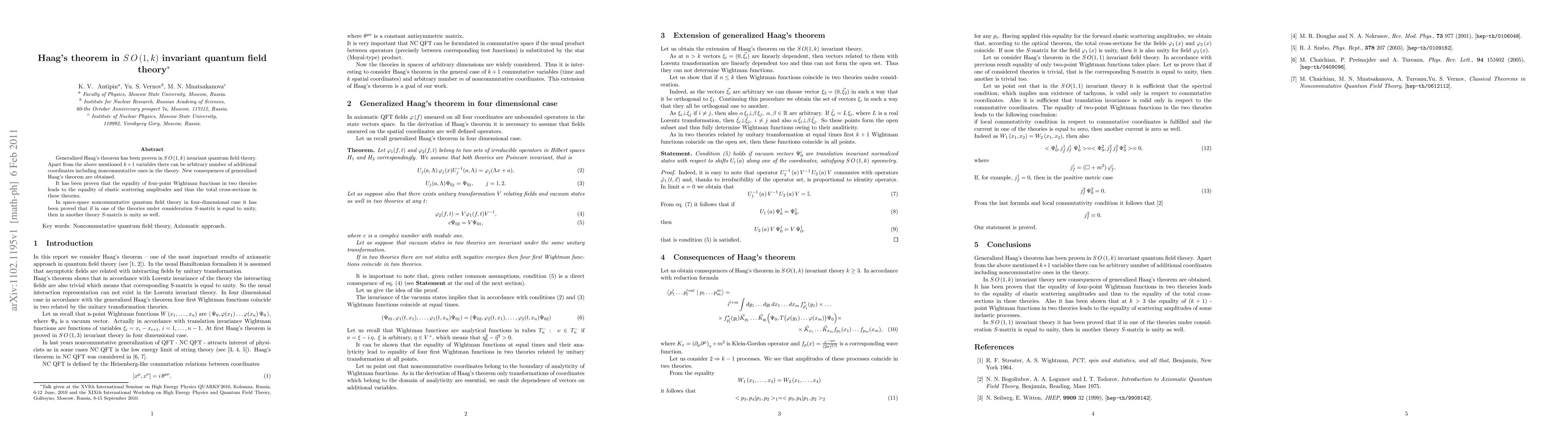 This research proves the generalized Haag's theorem in S O (1, k) invariant quantum field theory, demonstrating that equality of four-point Wightman functions equates elastic scattering amplitudes and total cross-sections in different theories, with new consequences in noncommutative quantum field theory.
