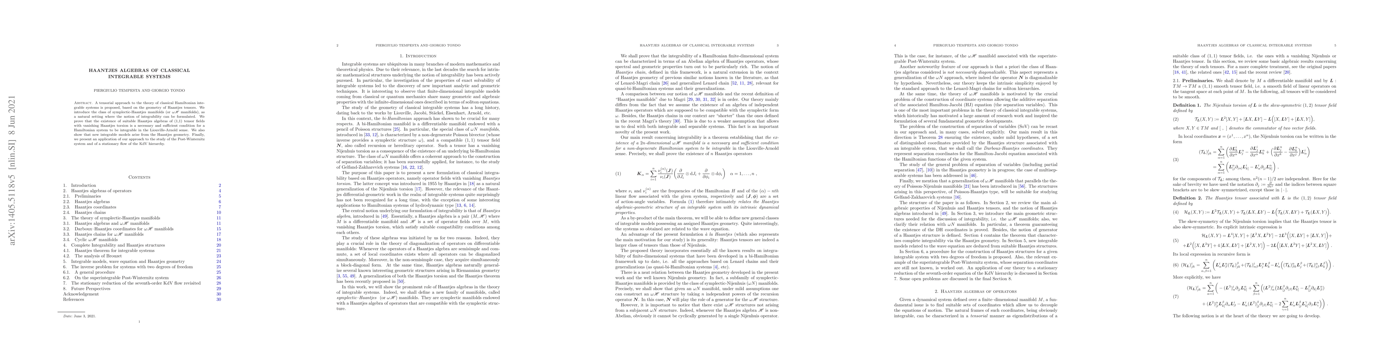 This paper proposes a tensorial framework based on Haantjes tensors for classical Hamiltonian integrable systems, introducing symplectic-Haantjes manifolds. It establishes Haantjes algebras as a necessary and sufficient condition for Liouville-Arnold integrability, and applies the approach to analyze the Post-Winternitz system and a KdV hierarchy flow.