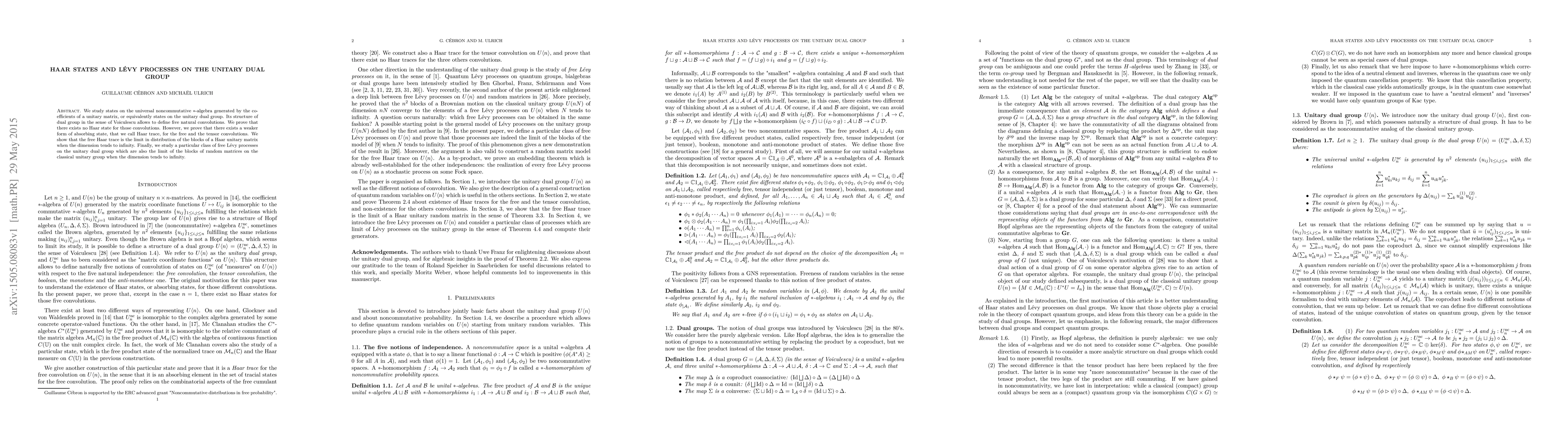 We study states on the universal noncommutative *-algebra generated by the coefficients of a unitary matrix, or equivalently states on the unitary dual group. Its structure of dual group in the sense of Voiculescu allows to define five natural convolutions. We prove that there exists no Haar state for those convolutions. However, we prove that there exists a weaker form of absorbing state, that we call Haar trace, for the free and the tensor convolutions. We show that the free Haar trace is the limit in distribution of the blocks of a Haar unitary matrix when the dimension tends to infinity. Finally, we study a particular class of free L\'evy processes on the unitary dual group which are also the limit of the blocks of random matrices on the classical unitary group when the dimension tends to infinity.