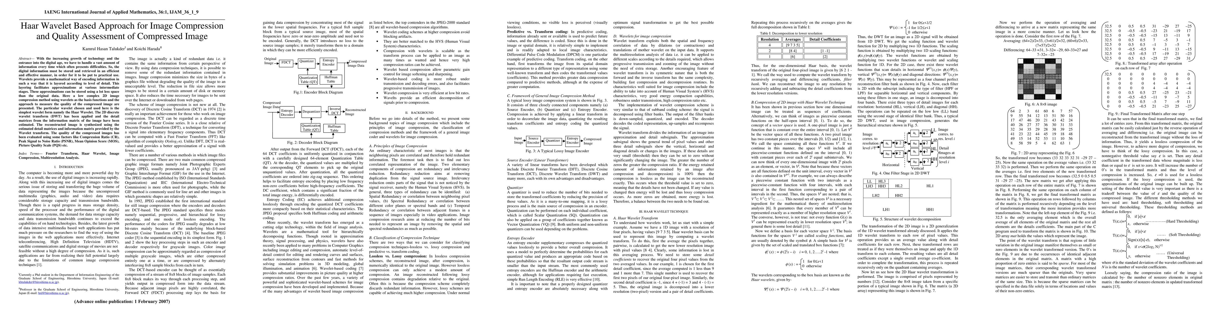 This paper presents a low-complexity 2D image compression method using Haar wavelets and the 2D discrete wavelet transform (DWT). The quality of the compressed images is assessed using metrics like Compression Ratio, PSNR, MOS, and PQS.