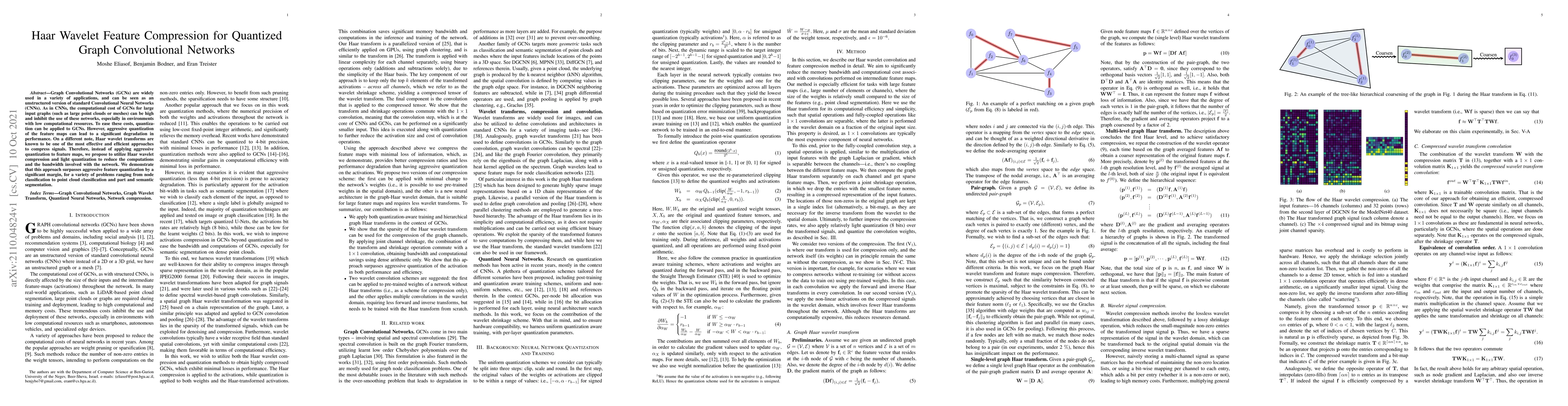 This paper proposes using Haar wavelet feature compression combined with light quantization to reduce computational costs and bandwidth in Graph Convolutional Networks (GCNs), achieving better performance than aggressive quantization alone across various tasks including node classification and point cloud segmentation.