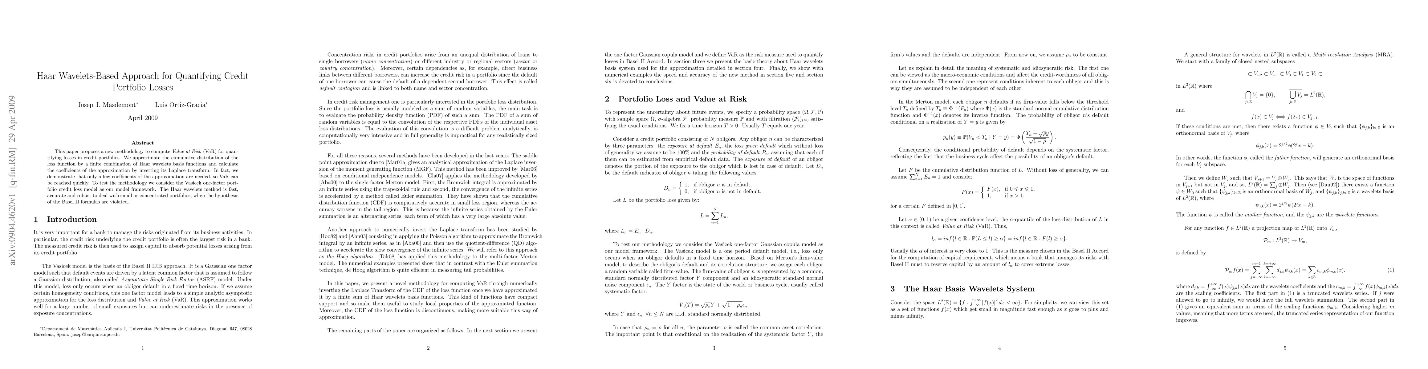 This paper proposes a new methodology to compute Value at Risk (VaR) for quantifying losses in credit portfolios. We approximate the cumulative distribution of the loss function by a finite combination of Haar wavelets basis functions and calculate the coefficients of the approximation by inverting its Laplace transform. In fact, we demonstrate that only a few coefficients of the approximation are needed, so VaR can be reached quickly. To test the methodology we consider the Vasicek one-factor portfolio credit loss model as our model framework. The Haar wavelets method is fast, accurate and robust to deal with small or concentrated portfolios, when the hypothesis of the Basel II formulas are violated.