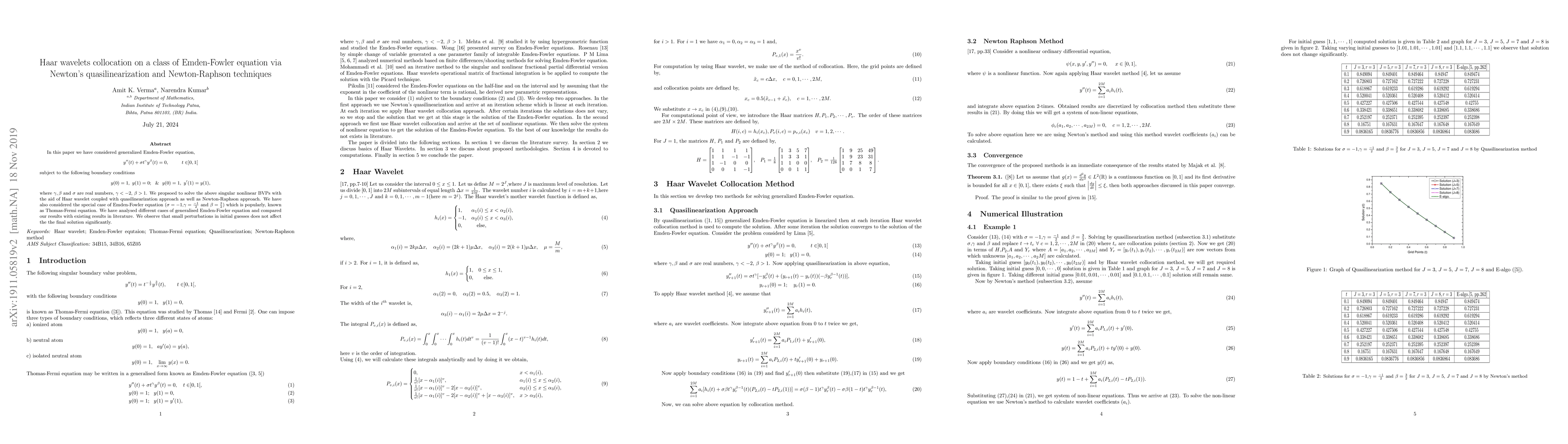 This paper proposes a solution to generalized Emden-Fowler equations using Haar wavelets combined with Newton's quasilinearization and Newton-Raphson techniques. Results show that the method is effective and robust, even for small perturbations in initial guesses.